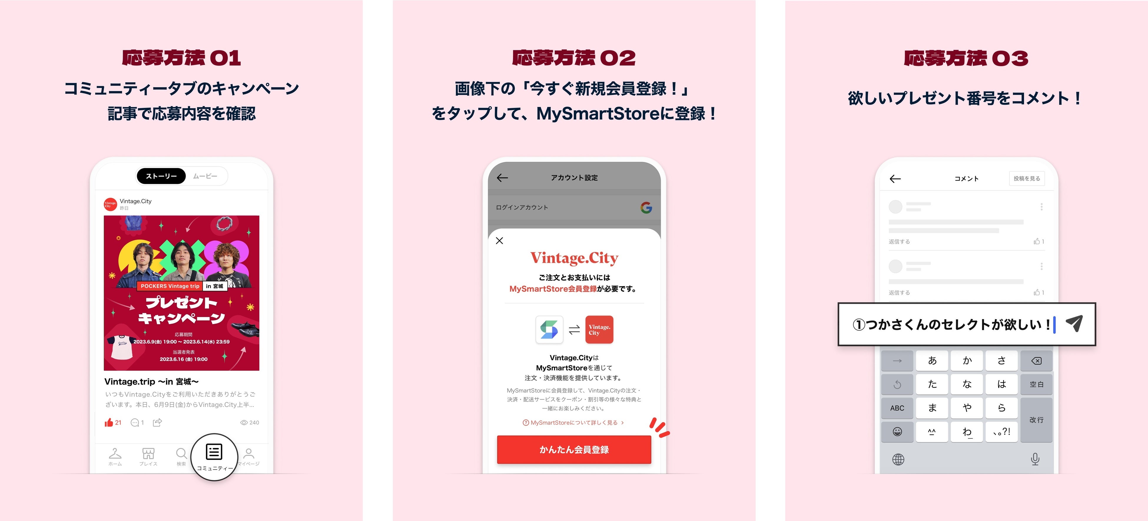 STEP1.ヴィンテージ・ファッション・アプリ「Vintage.City(ヴィンテージ・シティ)」内の「コミュニティ」ページに公開される「キャンペーン記事」で応募内容を確認。