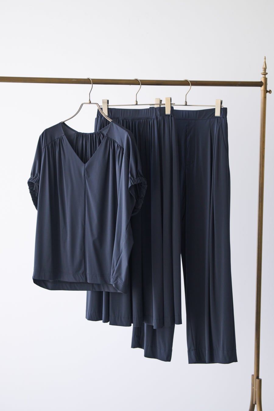 〈水着風素材〉Vネックプルオーバー(14,300円)、ギャザースカート(18,700円)、ワイドパンツ(19,800円)
