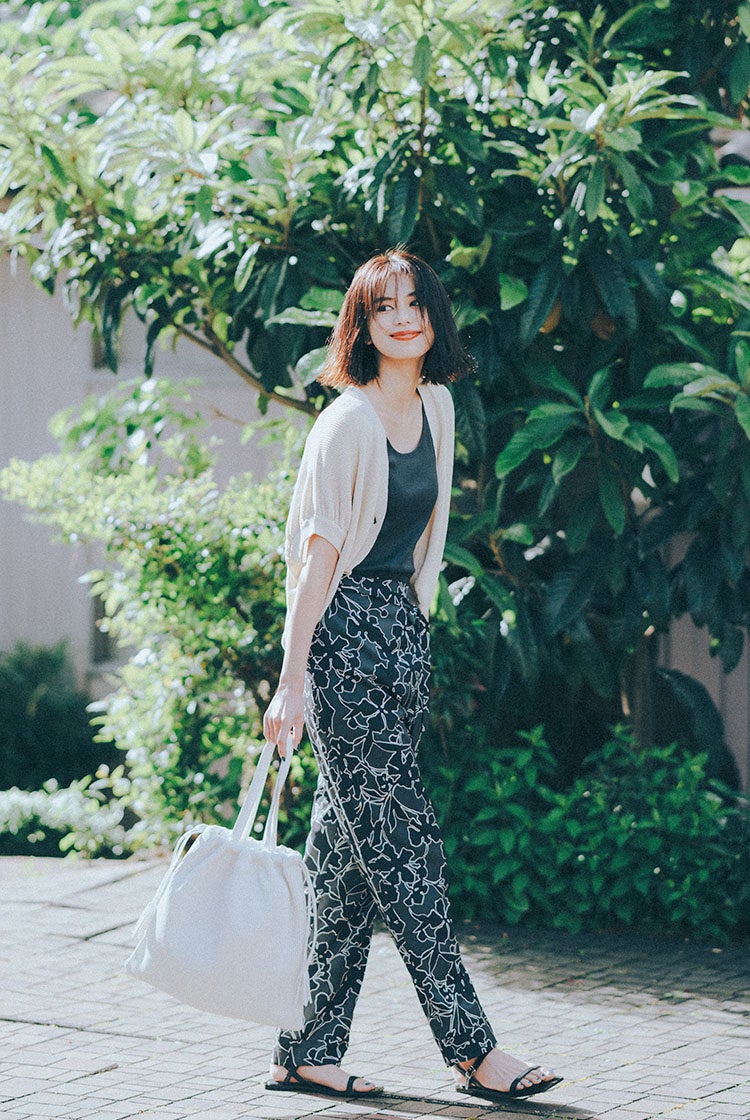 夏らしいオリジナルの花柄プリント。キャミソールワンピースは、一枚で着るのはもちろん、カットソーをインナーに合わせてデイリーに着こなせます。ラップパンツは気になる腰まわりをカバーしてくれるゆるやかなテーパードシルエット。どちらもマシンウォッシャブル&ノーアイロン。