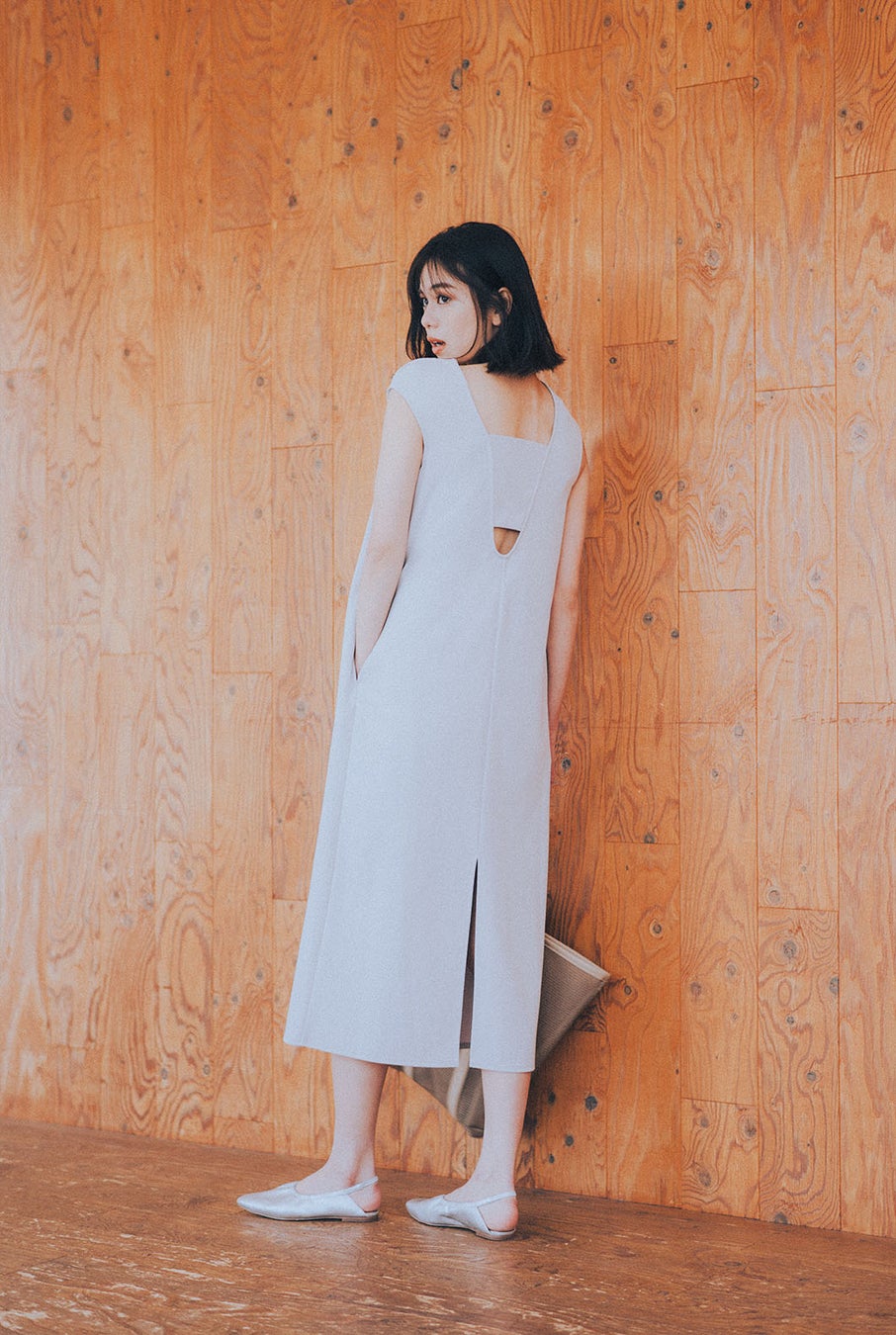 そのまま旅行コーデになるワンピースとバッグのセットアイテム。ワンピースは伸縮性があるので動きやすく、シワになりにくいジャージー素材。さりげない肌見せが叶う背中開きデザインがポイントです。