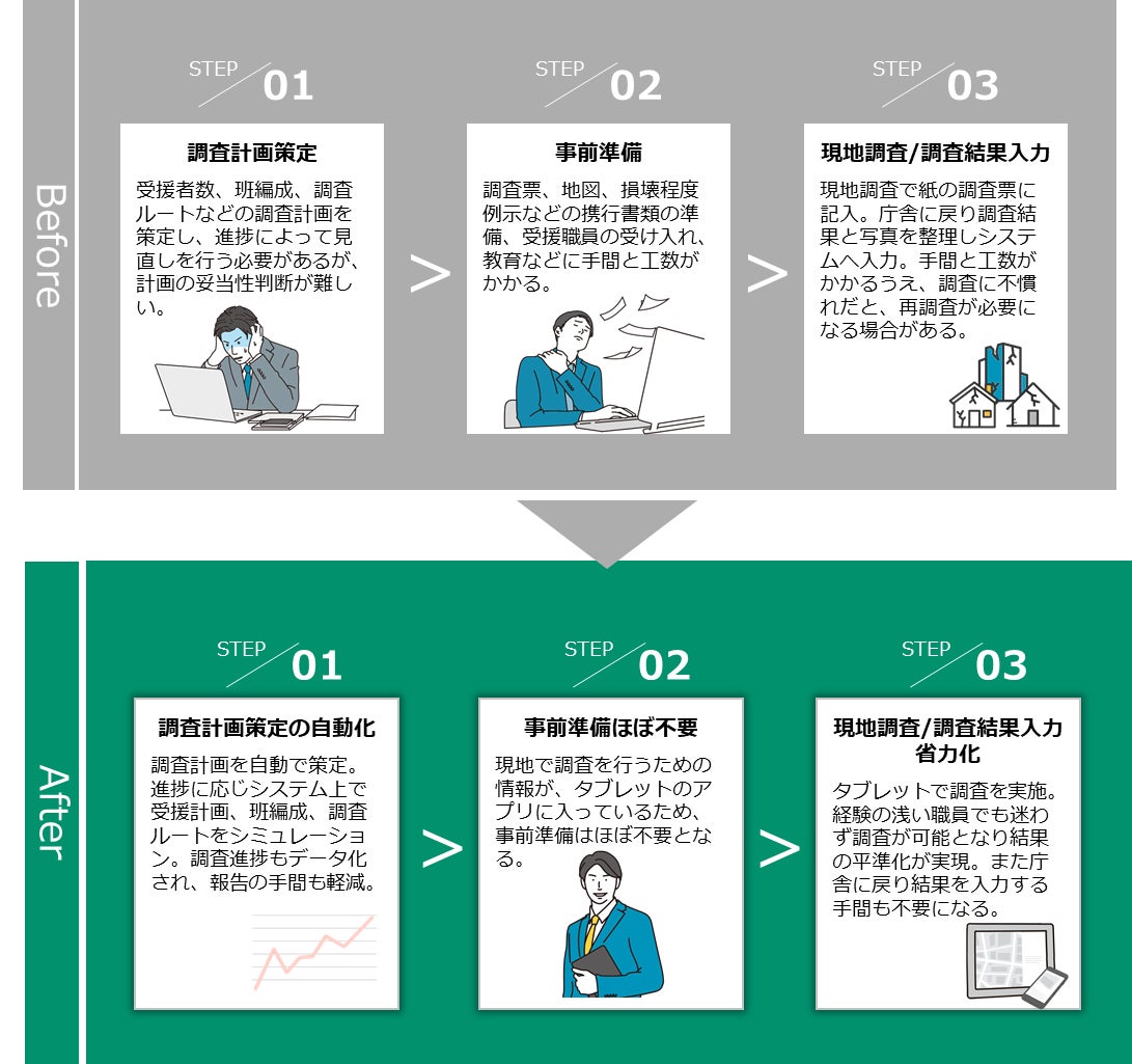 家屋の被害調査計画の策定や被害認定調査作業のビフォーアフター
