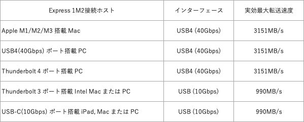 Express 1M2は、USB4搭載MacおよびPCのパフォーマンスを最大限に引き出すことを目的に開発されました。プロフォトグラファーやプロビデオグラファー、DITなどのプロシューマーの方々に、実効最大転送速度3151MB/sの高速性能を実現します。また、これまでに発売された多くのThunderboltやUSB-C搭載のパソコンやデバイスと互換性があります。