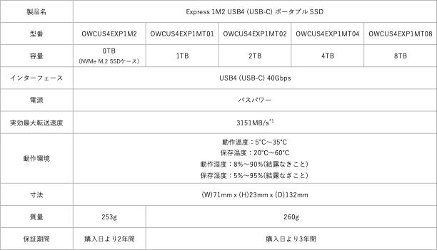 OWC Express 1M2 USB4(USB-C)ポータブルSSD本格販売開始