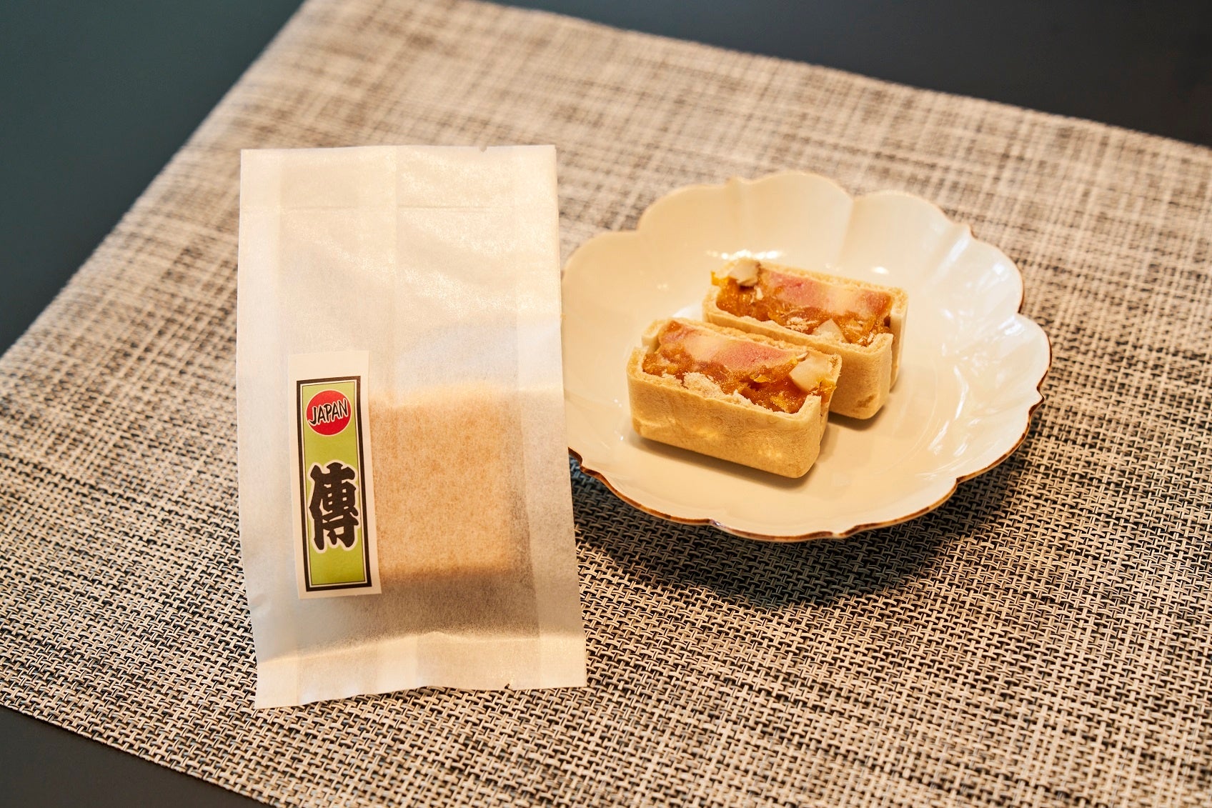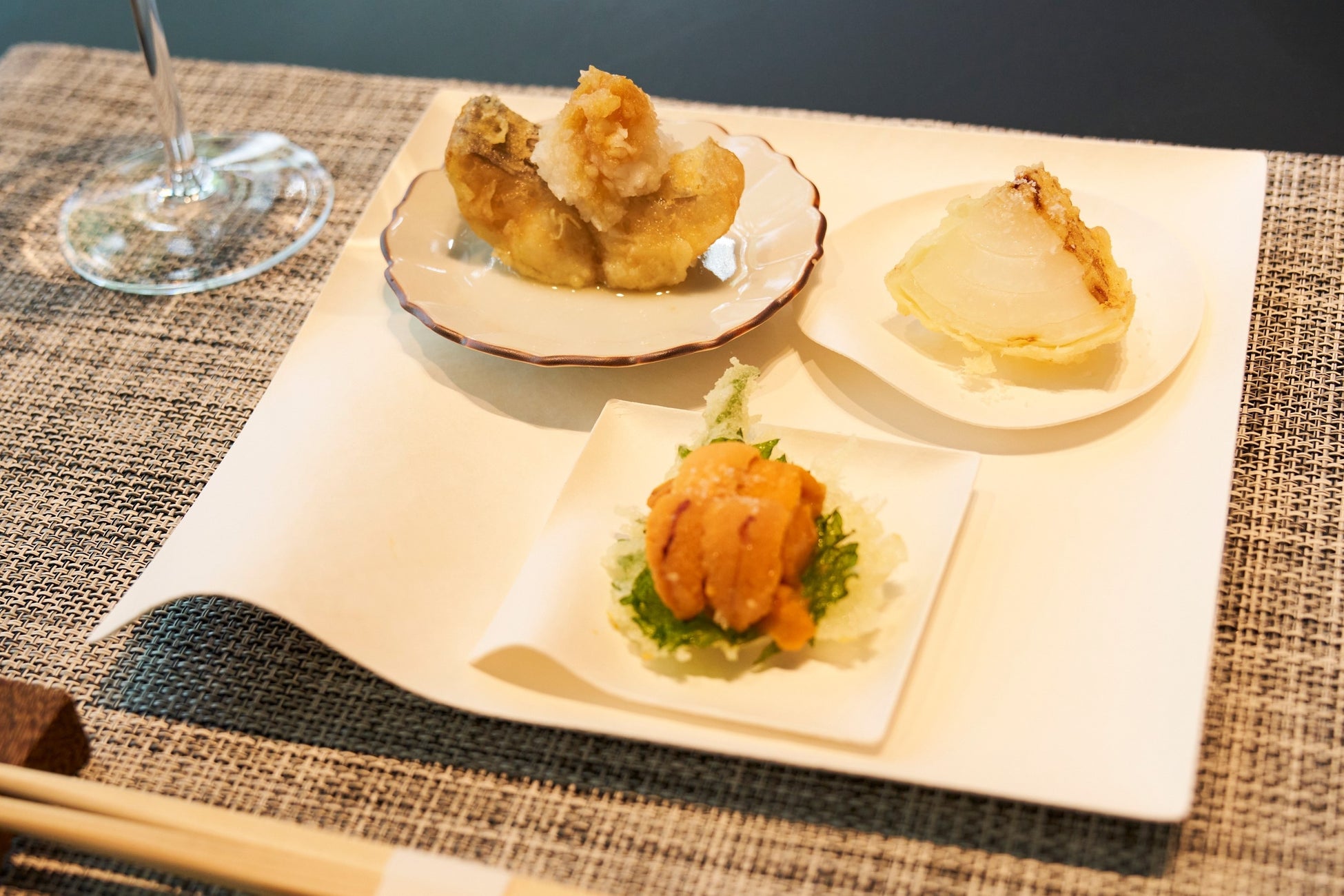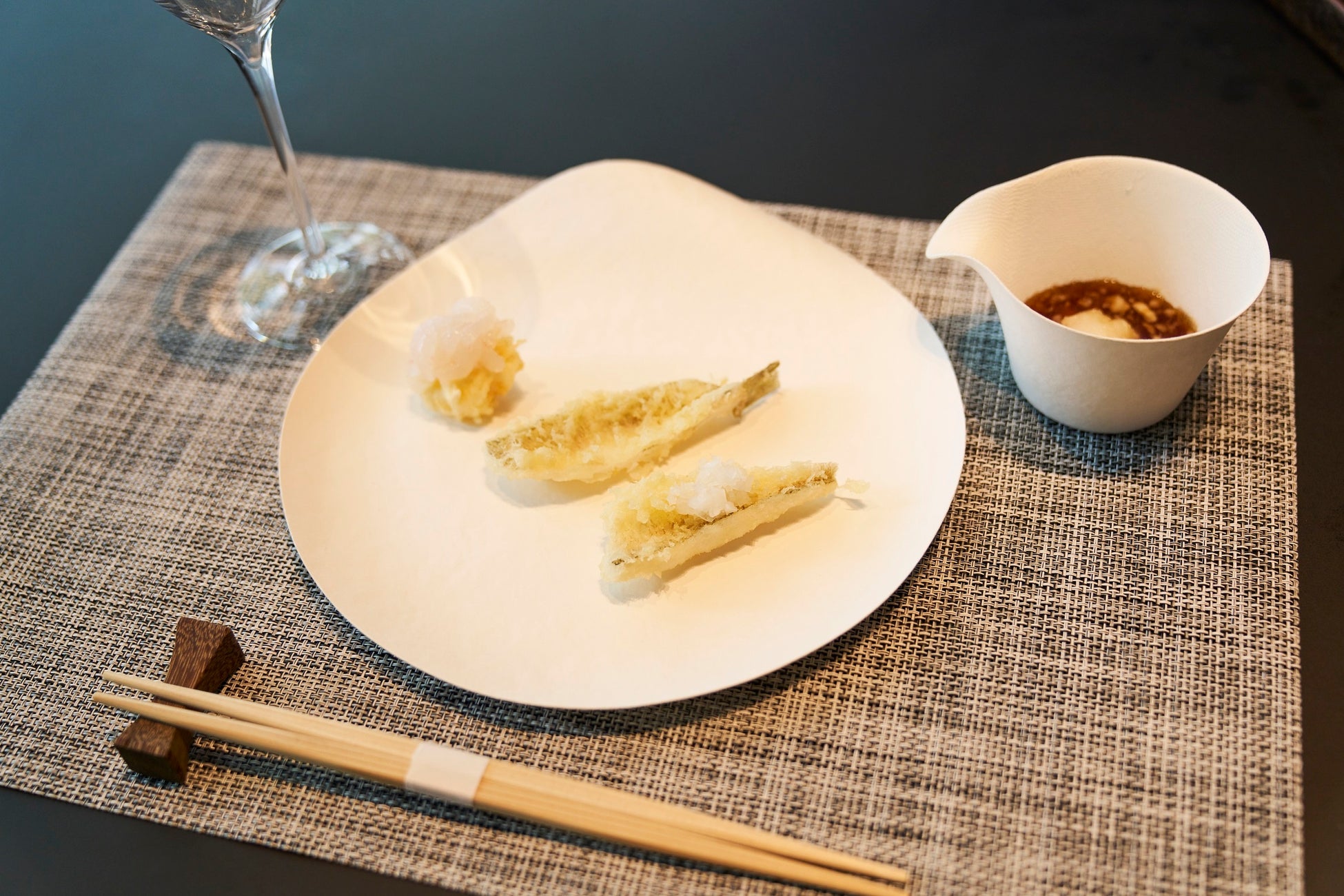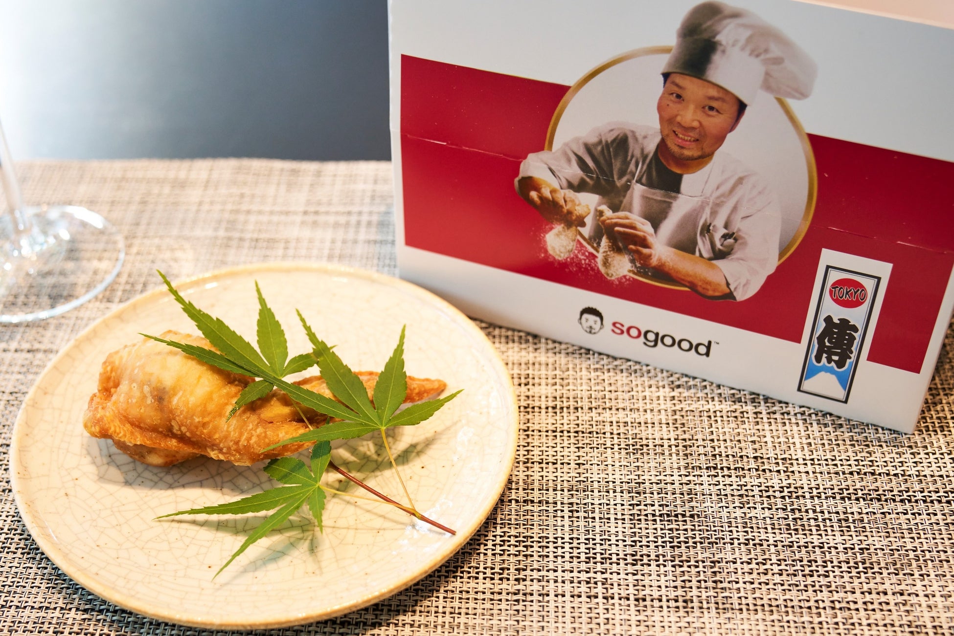 今日は「傳」からは、日本の伝統的な菓子である最中の技法を活かし、江戸時代には無かったフォアグラを組み合わせた「傳最中」という料理をお出ししました。脂っこいイメージのあるフォアグラを、西京味噌に漬けることでそれを感じさせないテクニックを取り入れたり、砂糖が高価だった江戸時代に小さな贅沢として楽しまれていた干し柿を合わせています。また、海外の方にも懐石料理の難しさや緊張を感じずに気兼ねなく楽しんでもらいたいという想いで、「傳タッキー」という一見フライドチキンのような見た目の料理もご用意しました。江戸前の伝統的な基礎を大事にしたうえで、型を破っていくことが「進化」につながっていくのではと思っています。」