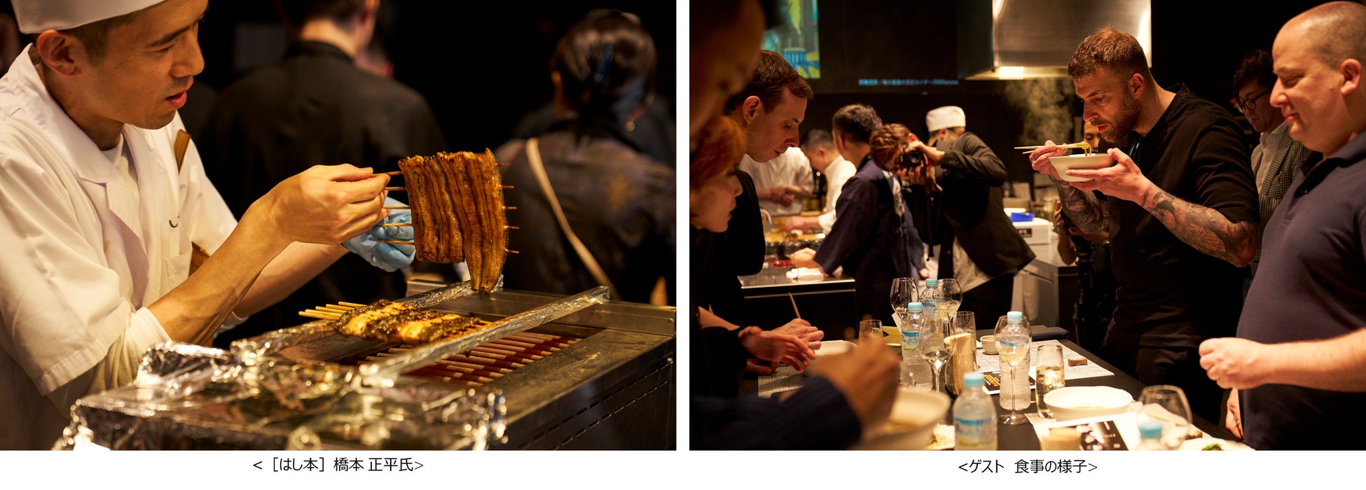 オープンキッチンには、2022年「アジアのベストレストラン50」で1位に選ばれた外苑前「傳」店主・長谷川在佑氏、ハワイやLAでの経験も経て白金高輪にオープンした「鮨まつうら」店主・松浦修氏、13年連続ミシュラン一つ星獲得の恵比寿「天ぷら元吉」店主・元吉和仁氏、西麻布で行列ができる大人気店で、ミシュランガイドでビブグルマンに選出されている「おそばの甲賀」店主・甲賀宏氏、日本橋の老舗であり、さらなる鰻料理の発展を目指す「鰻 はし本」4代目・橋本正平氏、の豪華シェフ陣5名が一堂に集結。通常では体験することのできないスペシャルディナーを、江戸時代の食の映像と共に参加者の目の前で調理しました。各店のシェフがプレゼンテーションを行った後、当時の屋台を再現するスタイルで江戸の四大名物の進化を魅せる料理の数々が提供され、料理ごとにこだわりのペアリングドリンクとともにお楽しみいただきました。