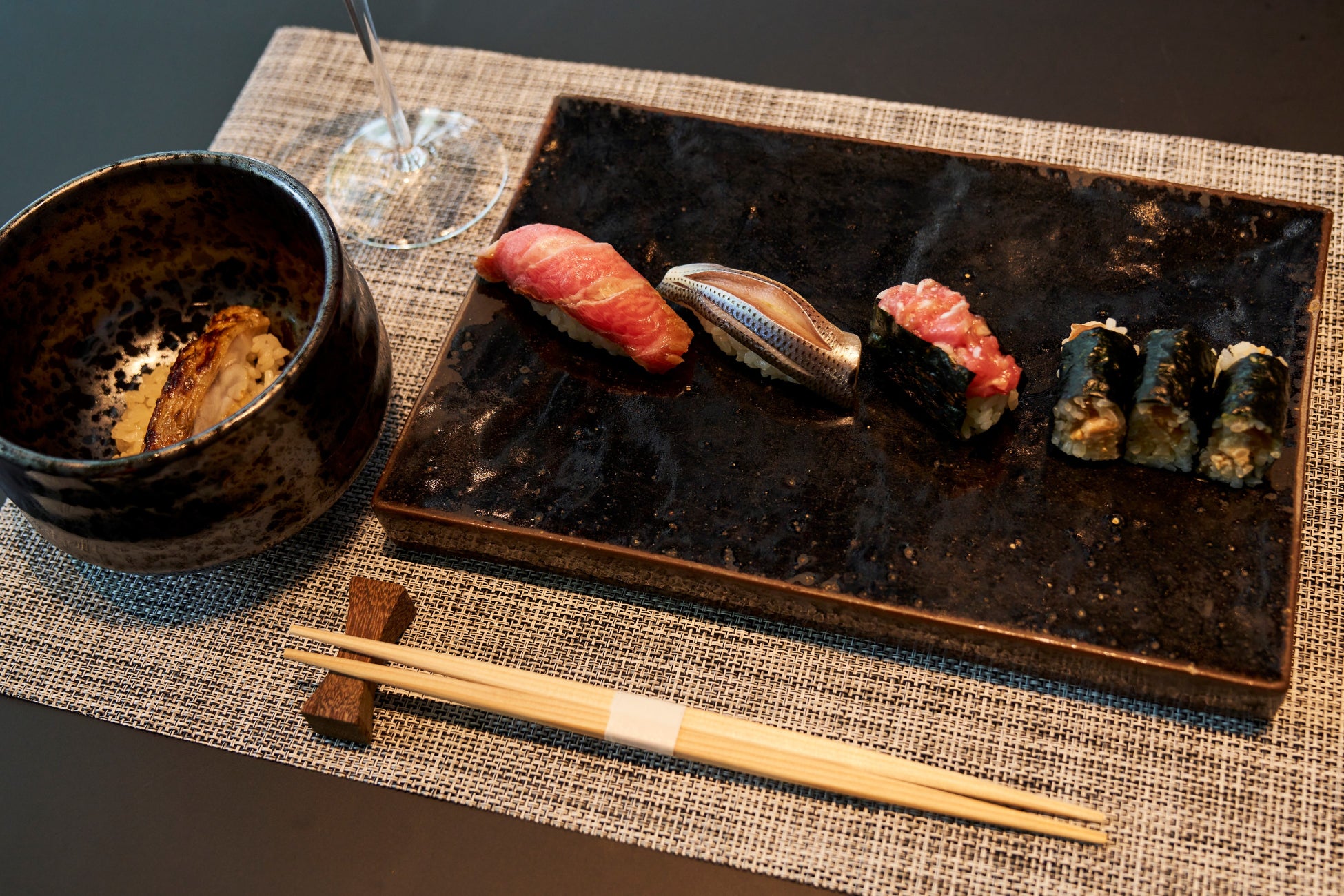 <鮨まつうら「大トロ漬け握り/小肌/鮪の脳天の握り/あん肝巻き/赤むつのどんぶり」>