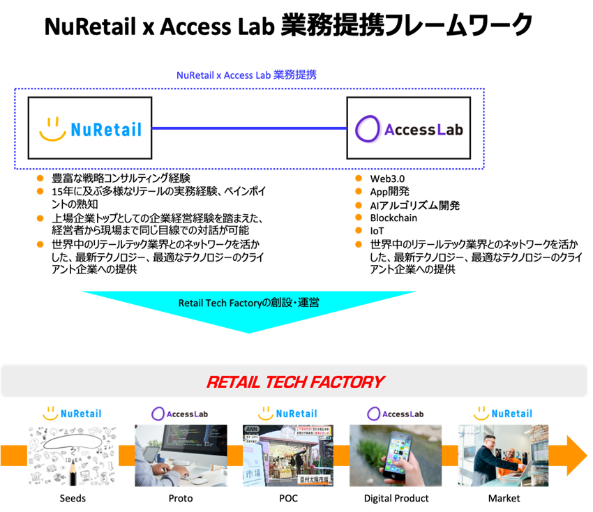 Agile Consulting(アジャイルコンサルティング): NuRetailが長年の実務経験で培った実効性の高い「リテールテックの使いどころ」とAccess Labのフルスタック開発能力を組み合わせ、クライアントのヴィジョン実現や課題解決に向けテクノロジー導入を前提としたアジャイルなコンサルティングを提供