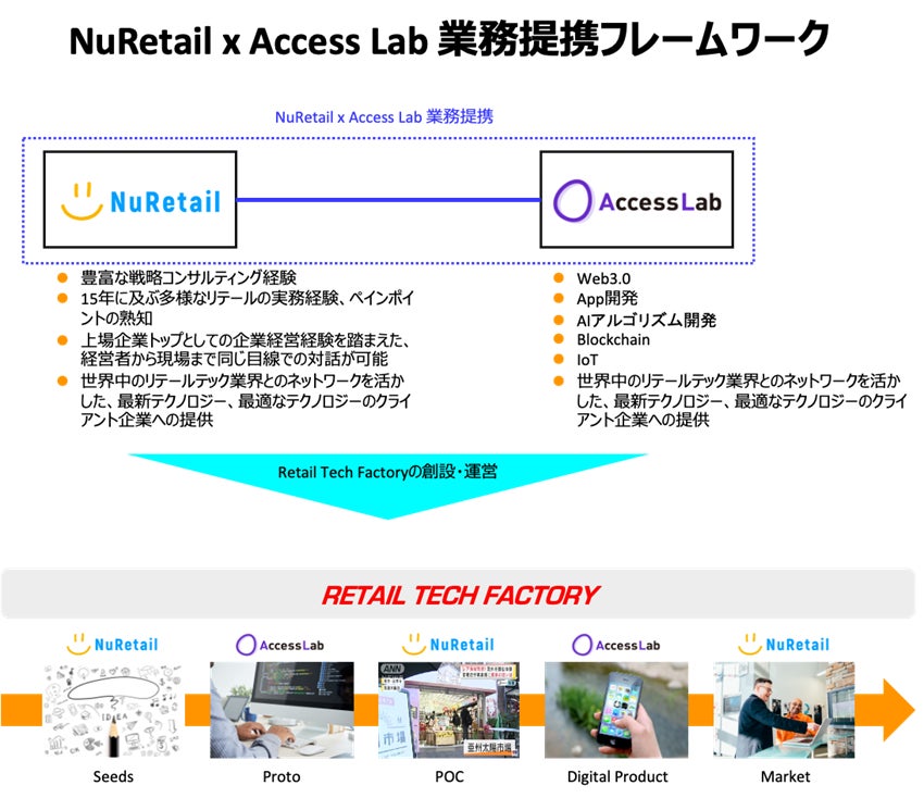 リテールテックスタートアップのNuRetail株式会社 (本社:東京都港区、代表取締役CEO:飯田健作)は、デジタルソリューションプロバイダーのAccess Lab(本社:東京都豊島区、代表:奥田大介)と業務提携を2024年4月30日付で締結しました。この業務提携を通じ両社は下記の三点にフォーカスし活動していきます。