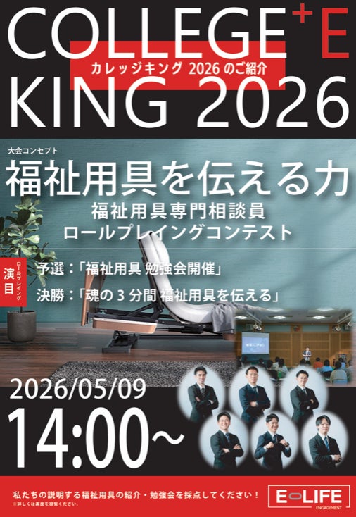 E-LIFE株式会社(本社:神奈川県横浜市瀬谷区三ツ境、以下「イーライフ」)は、2026年5月9日(土)、ナビオス横浜(横浜みなとみらい)にて、福祉用具専門相談員によるロールプレイングコンテスト「COLLEGE⁺E KING 2026」を開催いたします。本大会では、2025年度入社の新卒社員が、ケアマネジャーをはじめとする専門家に対し、福祉用具を通じた「生活課題の解決」をプレゼンテーション形式で競い合います。当社が長年培ってきた育成・現場指導メソッドは、全国展開する大手薬局グループからも高い評価を受けており、業務連携および人材育成支援にもつながっております。本イベントは、その育成モデルを社内外へ発信し、業界全体の人材育成の質向上に寄与することを目的としております。