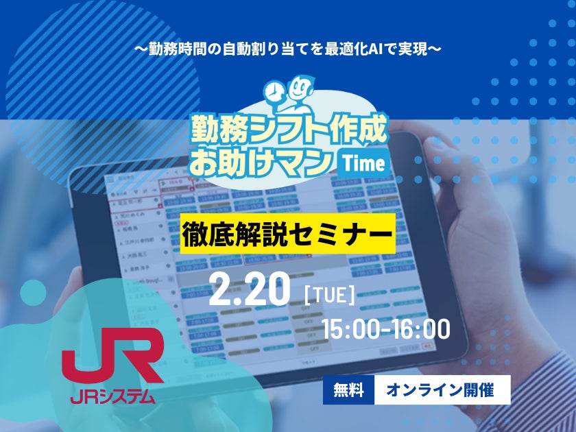 鉄道情報システム株式会社(本社:東京都渋谷区、代表取締役社長:本多博隆、略称:JRシステム)は、シフト管理サービス「勤務シフト作成お助けマン」を紹介するオンラインセミナーを2月20日に開催します。