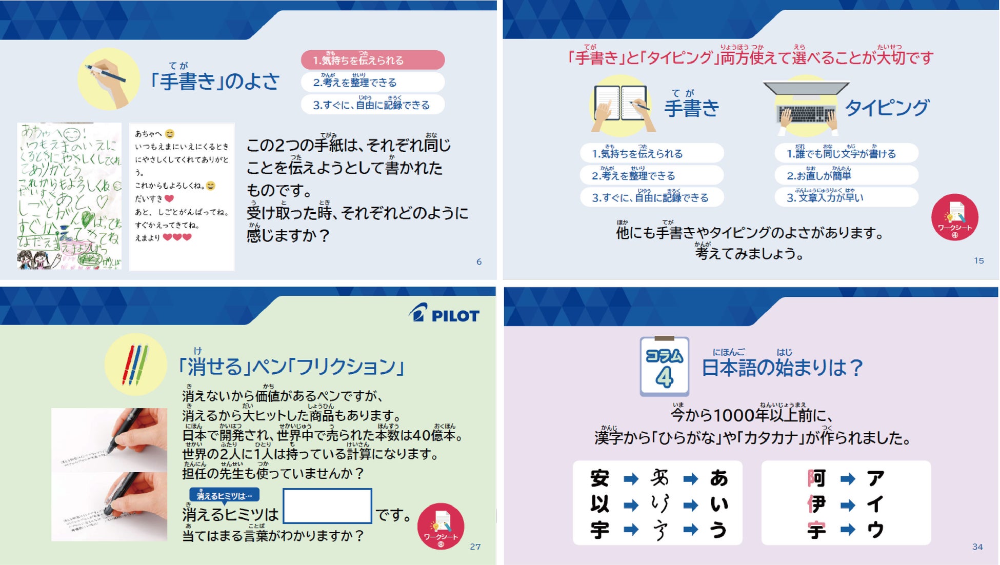 本年度のプログラムにおいてもタブレット端末などを併用しながら、手書きとタイピングそれぞれの良さを理解し、その適切な使い分け方、手書きが深い思考をもたらすこと、加えて日本語の歴史や文化についても学ぶことができる内容となっています。