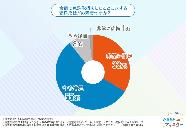 最後に、「合宿で免許取得をしたことに対する満足度はどの程度ですか?」と質問したところ、『非常に満足(33.7%)』『やや満足(55.8%)』『やや後悔(8.9%)』『非常に後悔(1.6%)』と続きました。