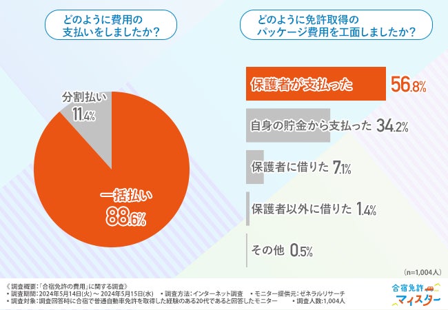 パッケージ費用の支払い方法と工面方法については、約9割が一括で支払いを行っており、合宿免許参加者の約6割が保護者に費用を支払ってもらっていることが明らかになりました。