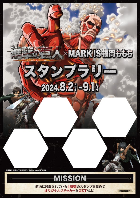 MARK IS 福岡ももち(福岡市中央区)は、8月2日(金)から9月1日(日)まで、世界180ヵ国累計発行部数1億1,000万部超えの人気アニメ「進撃の巨人」の世界を楽しめる夏のコラボイベント「進撃の巨人×MARK IS 福岡ももち」を開催します。