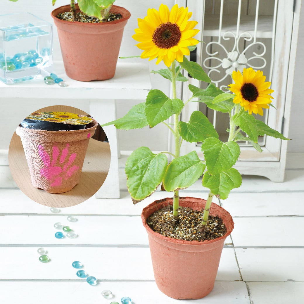 地球にやさしい材料でできた植木鉢を、手形で飾って