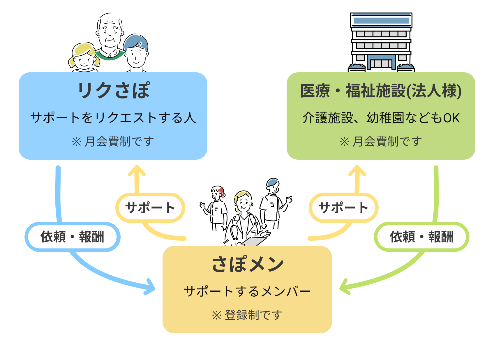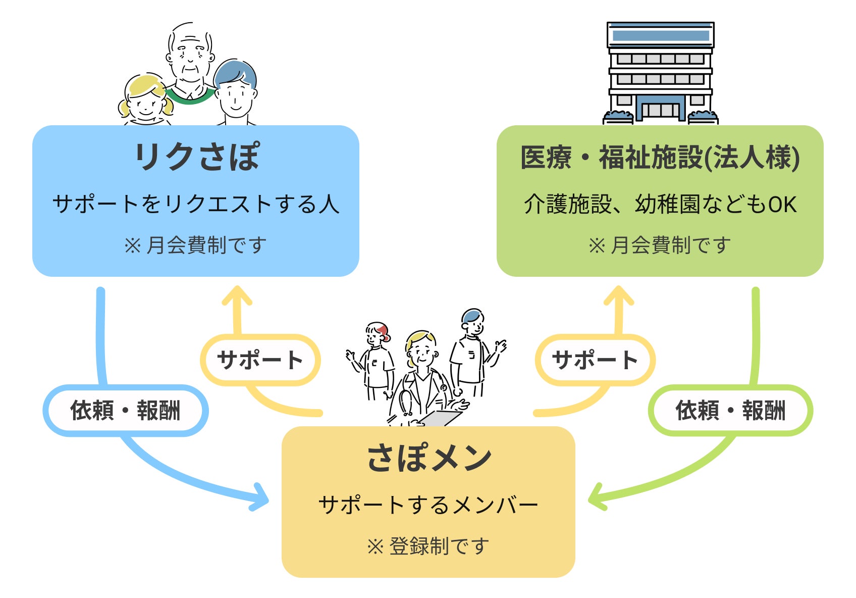 登録制で、“リクエスト掲示板”に、いつ、どこで、どんなことを、いくらくらいでお願いしたいのかを書き込み、サポートできる有資格者が自ら挙手して有償ボランティアを実施できる仕組みとなっています。