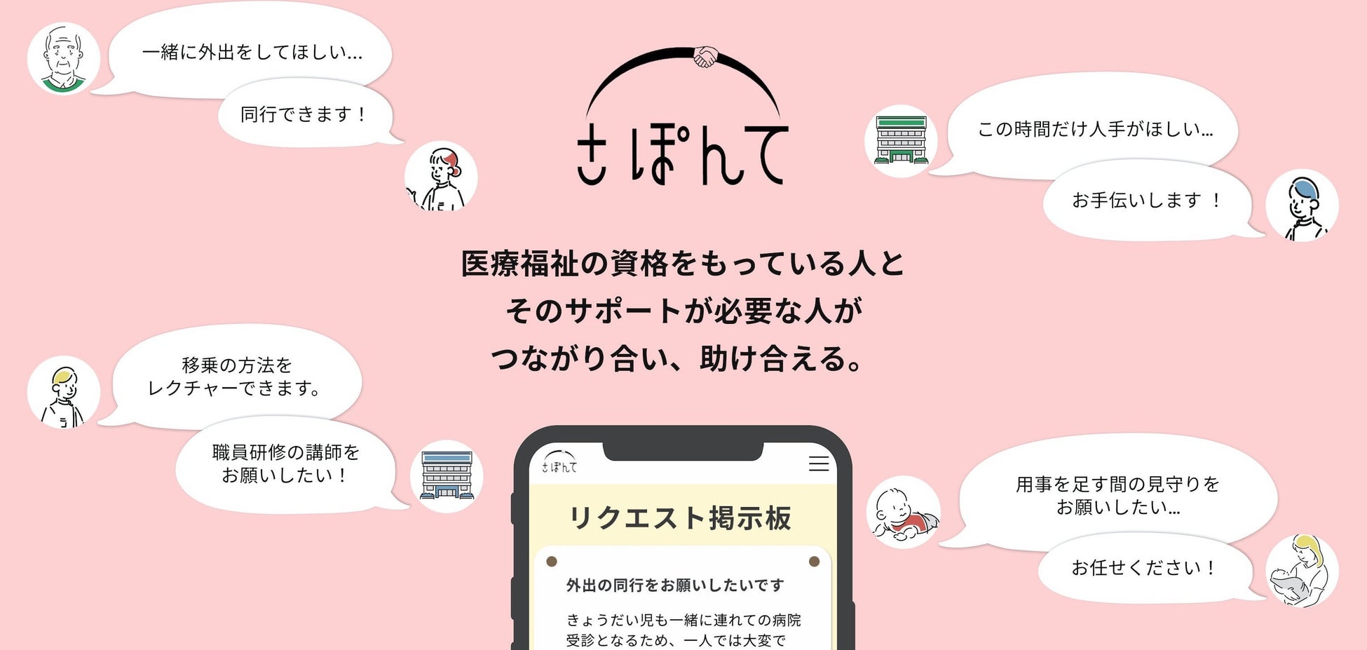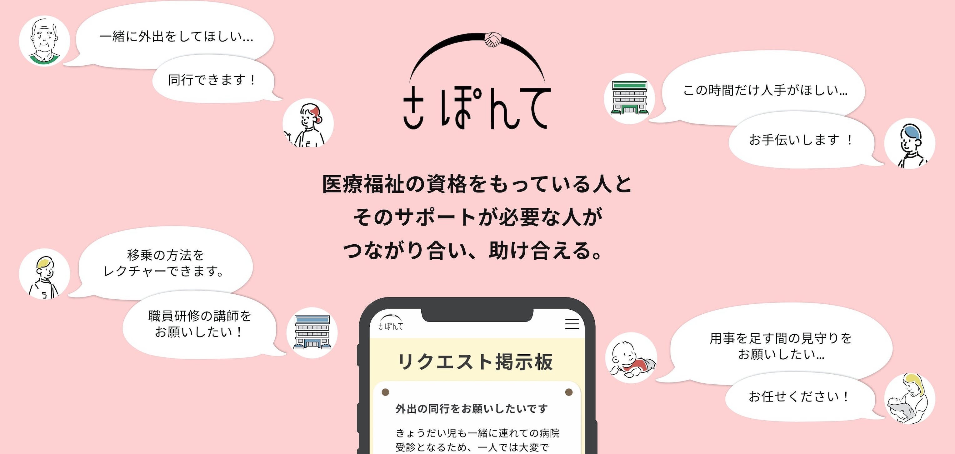 「さぽんて」は、医療・福祉・介護の有資格者と、サポートが必要な人が、つながり合い助け合うWEBサイト。