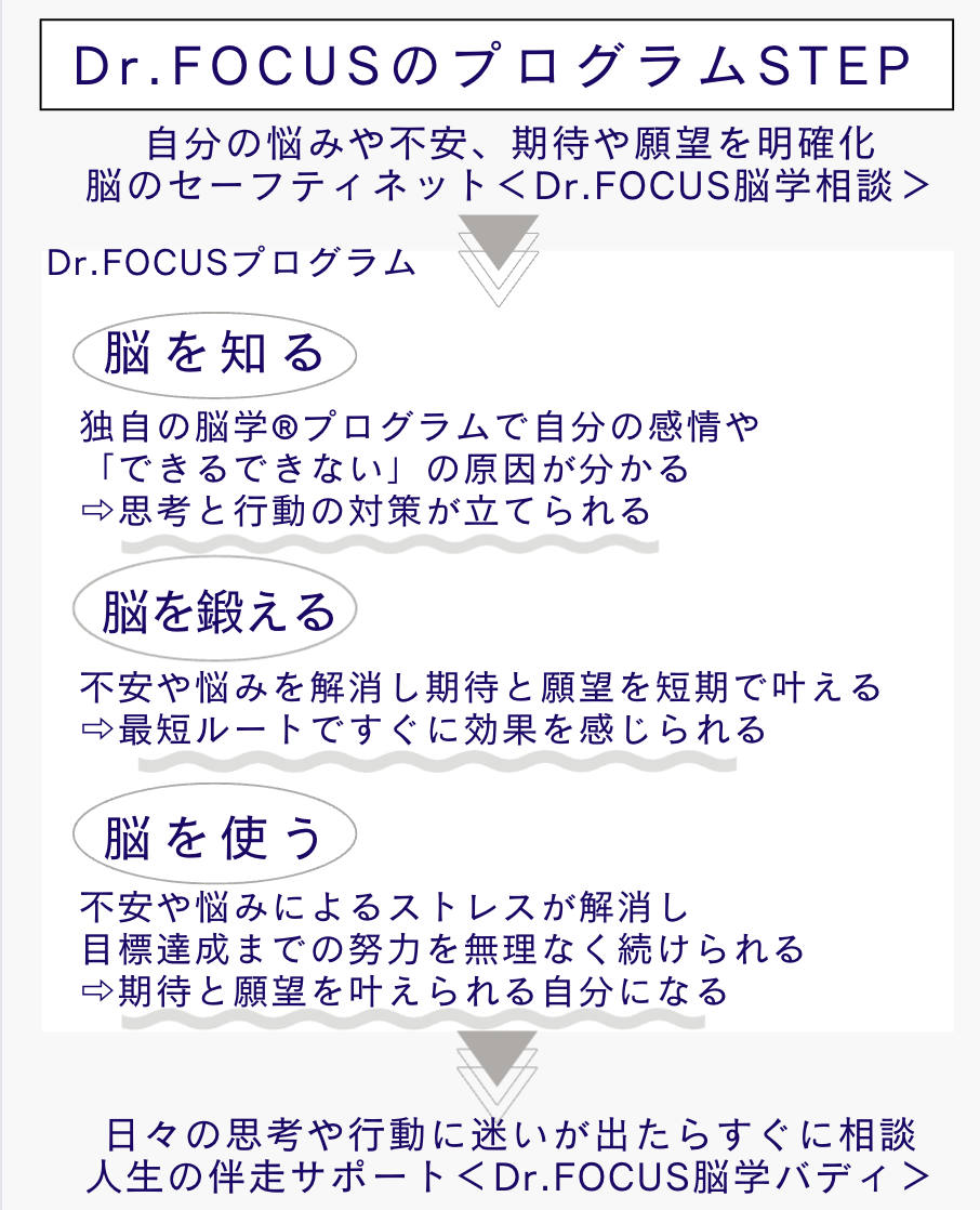 【Dr.FOCUSプログラム】:脳学®︎→脳トレ→脳活の3STEPで習慣化をサポート