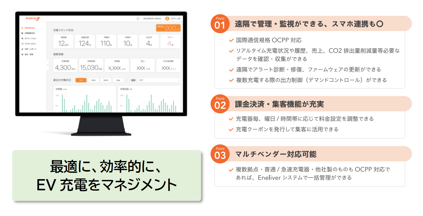 「Eneliver Cloud」は、マルチベンダーに対応した充電管理システムとして、様々な充電器メーカーや販売店と協力し、EV充電インフラの拡充に貢献して参ります。