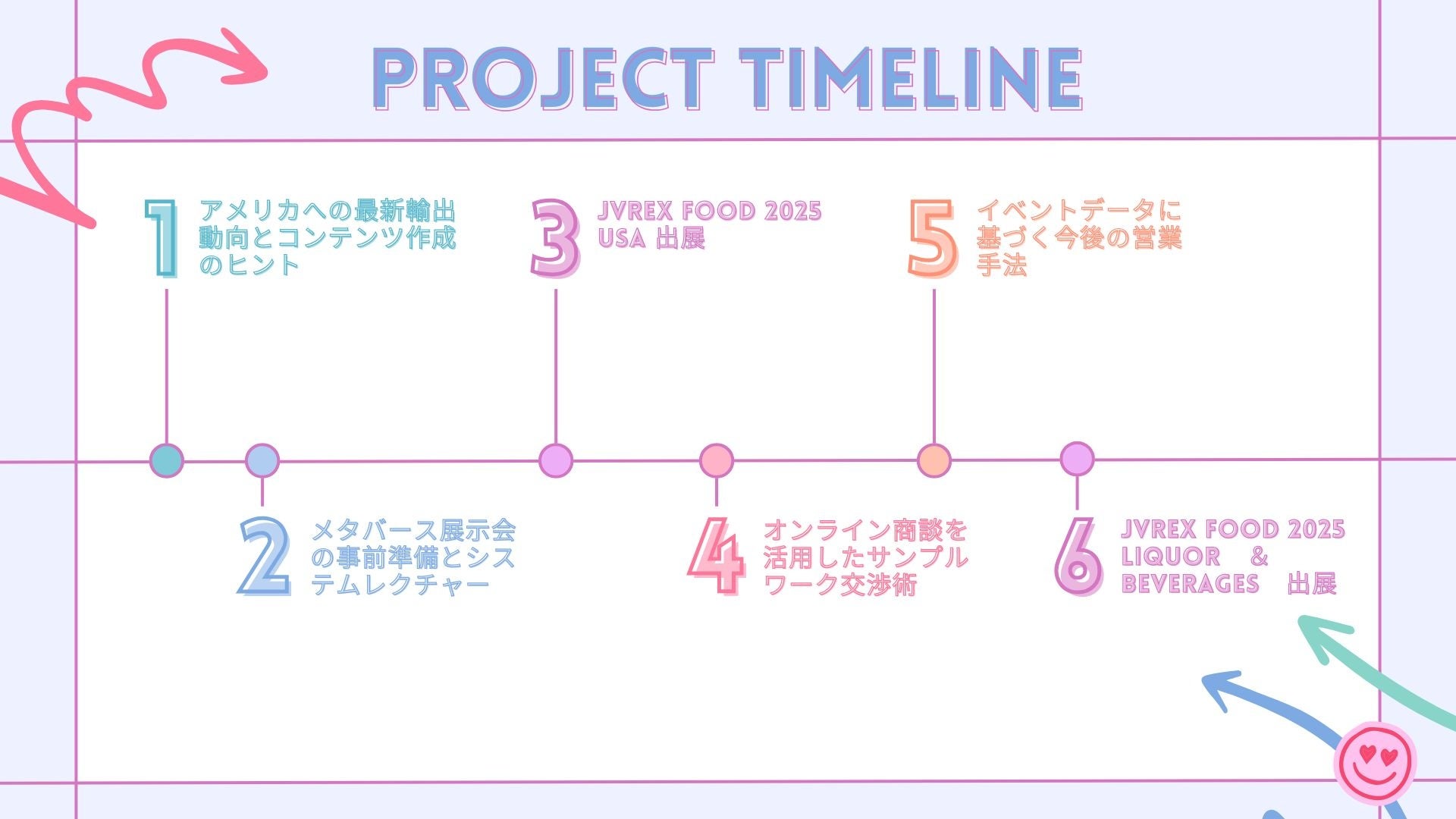 アメリカ向けのメタバース展示会「JVREX Food 2025 USA」および酒類・清涼飲料水に特化した「JVREX Food 2025 Liquor & Beverages」に出展するにあたり、市場動向などの前情報からシステムのレクチャー、具体的なセールスプロセスやメールでのアプローチをするための文例など、奈良県商工会連合会の専門家派遣制度を通した勉強会を一連のプロジェクトとしてアレンジするなどし、奈良から世界へはばたく地域企業の海外展開を後押しする取り組みを行いました。