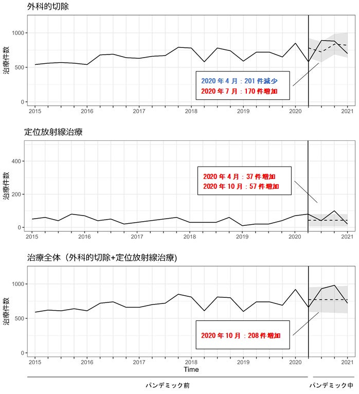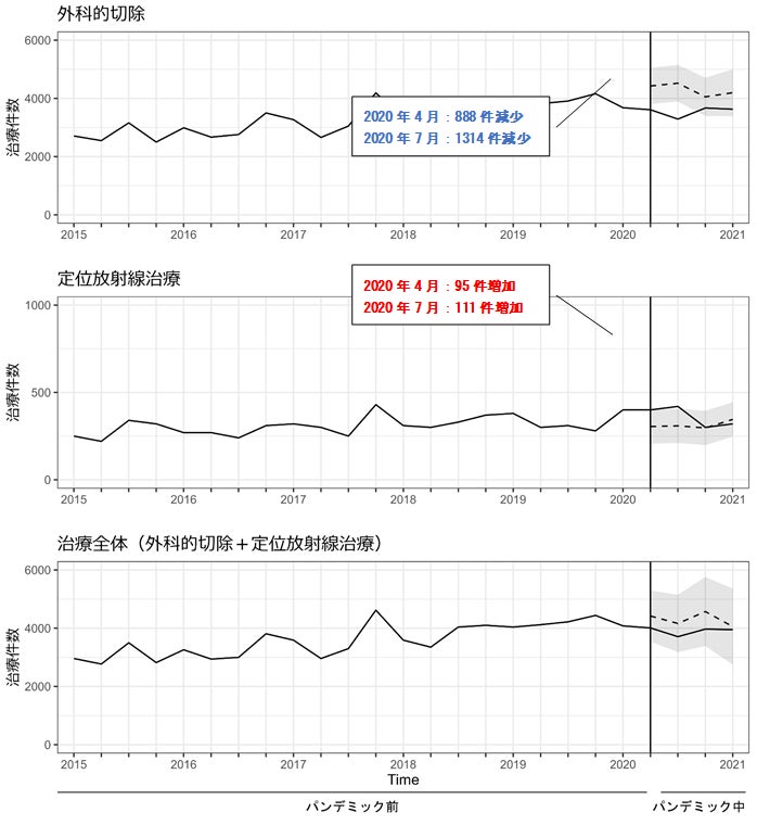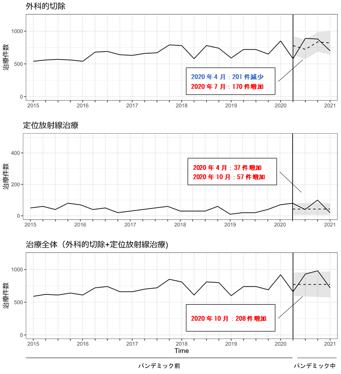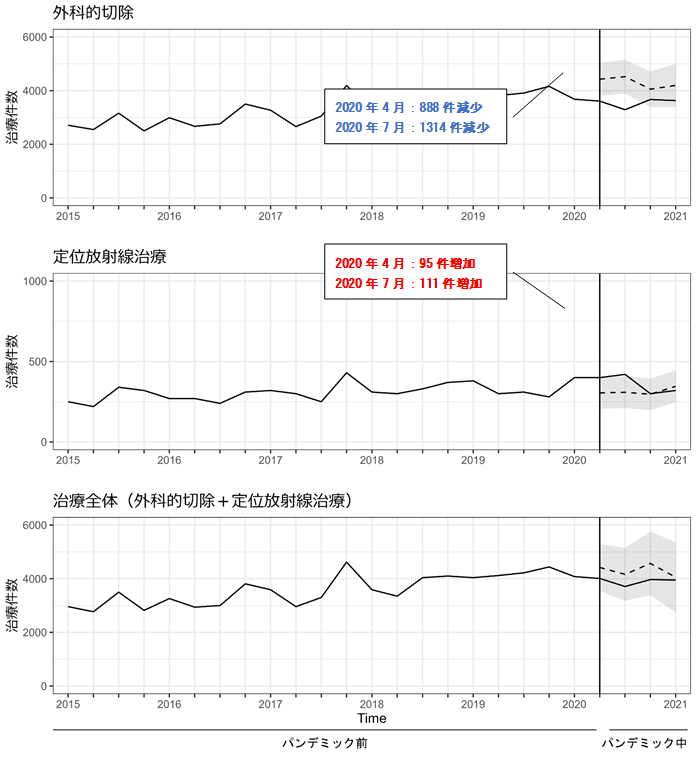 実線:観察された治療件数、点線:パンデミック前の推移から予測されたパンデミック中の件数(パンデミックがなかったと仮定した場合の予測値)、灰色の網掛け:95%信頼区間(観察された件数が網掛けの外の場合、統計学的に有意に変化していると判断する)