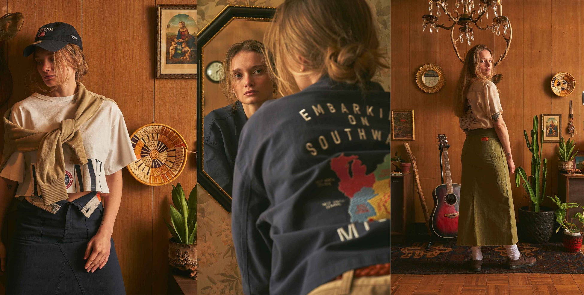 ウィメンズはトレンドらしいサイズ感にリサイズされたカバーオールと、計算されたパターンによるデザインの切り返しとストレスフリーな着用感が魅力的なスカートのセットアップとなっている。