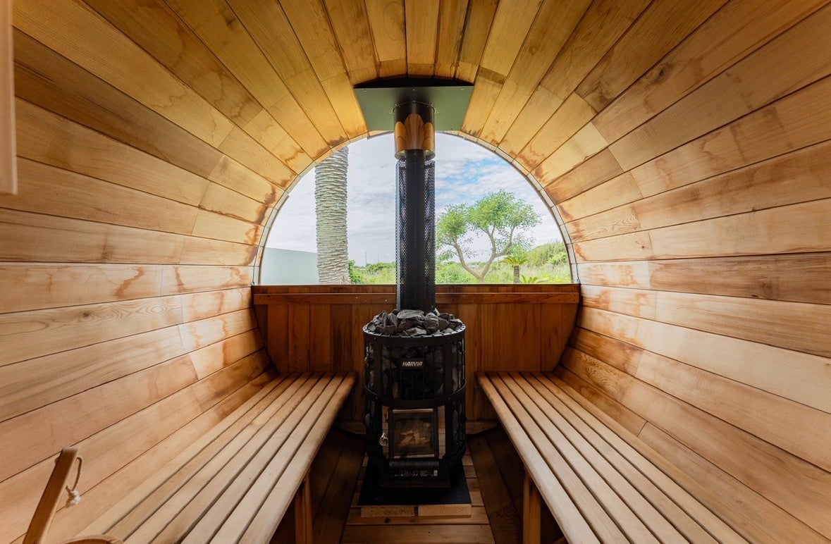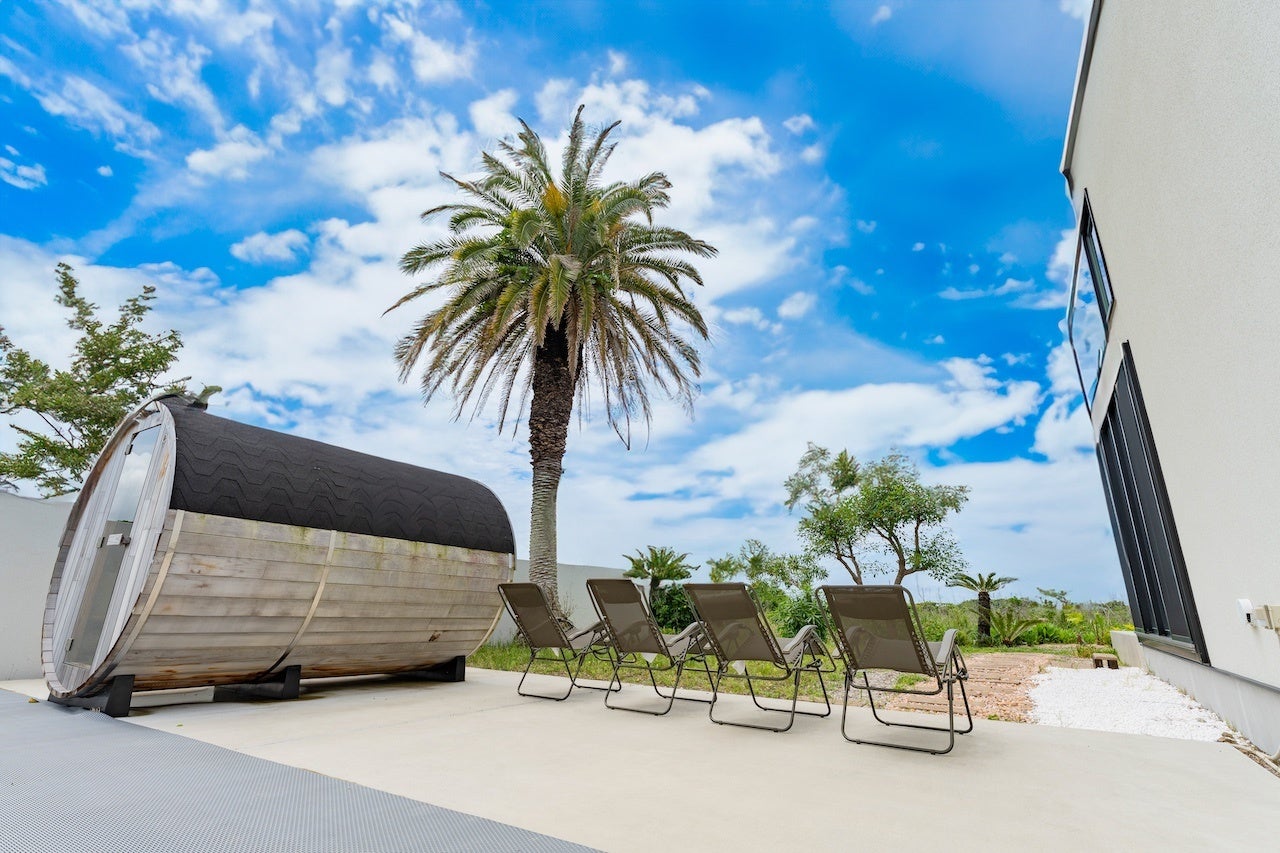 薪ストーブ式バレルサウナと中庭のプライベートガーデンを備えた、スモールラグジュアリーヴィラ。
