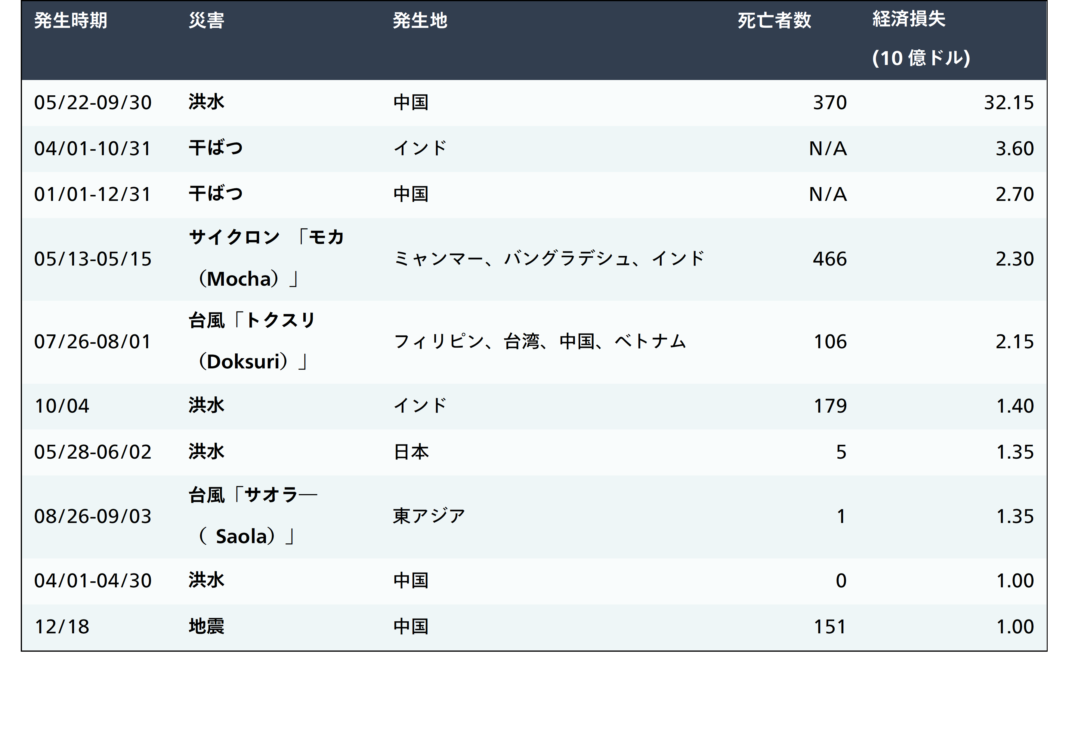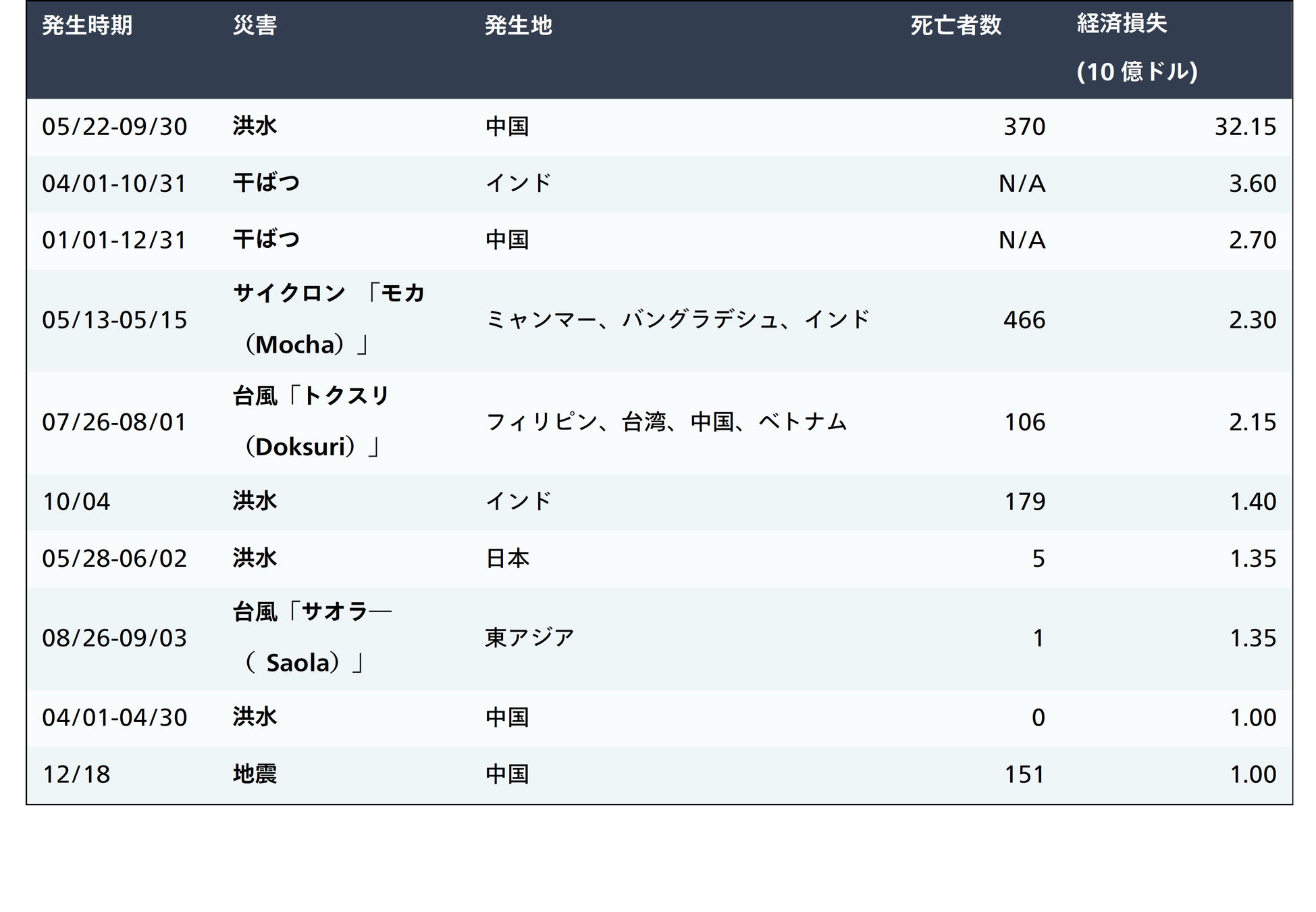 特に、4月と5月には、南アジアと東南アジアの多くの国が数週間にわたる熱波に見舞われ、特に中国とインドに影響を及ぼした干ばつにより、数十億ドルの損失が発生しました。