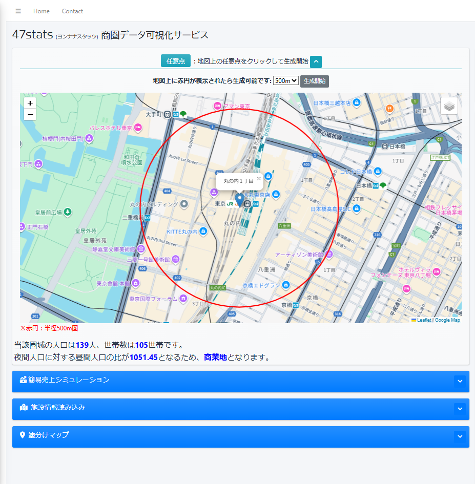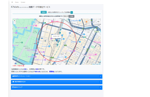 地図上から任意の地点をクリックするだけで、商圏で集約された各種統計データ情報を取得できます。