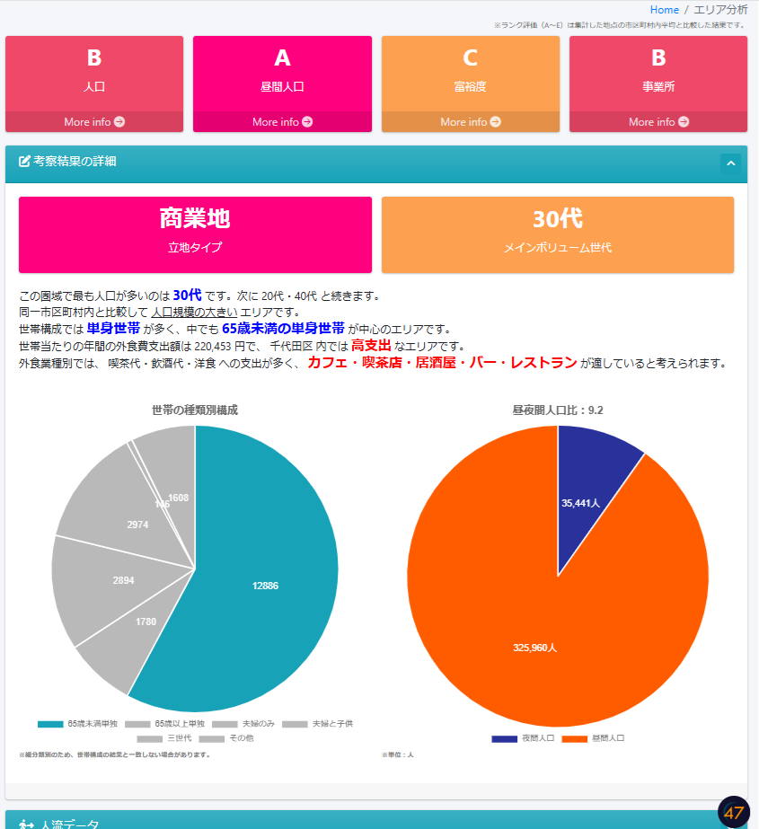 取得した統計データは、グラフや偏差値評価した結果で表示されるため、どのような特性を持った地域かを一目で把握することができます。