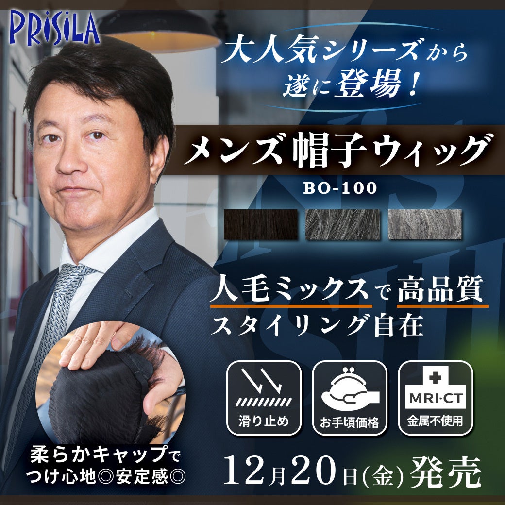 総合ウィッグメーカーの株式会社プリシラ(本社:兵庫県神戸市、代表取締役:富澤武志)は、シリーズ累計6万個を超える販売実績を持つ大人気の「帽子ウィッグ」シリーズより、初の男性用モデルを2024年12月20日(金)から発売いたします。