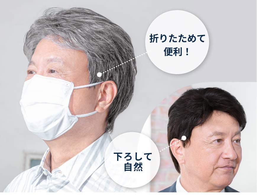 折りたたみ可能な2wayもみあげ付きで、折りたたむことでメガネやマスクを付けるときも、ストレスがかかりません。