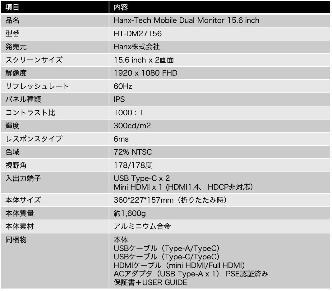 「Hanx-Tech Mobile Dual Monitor 15.6inch」 高精細なIPSパネル 15.6 + 15.6 inch 2画面搭載