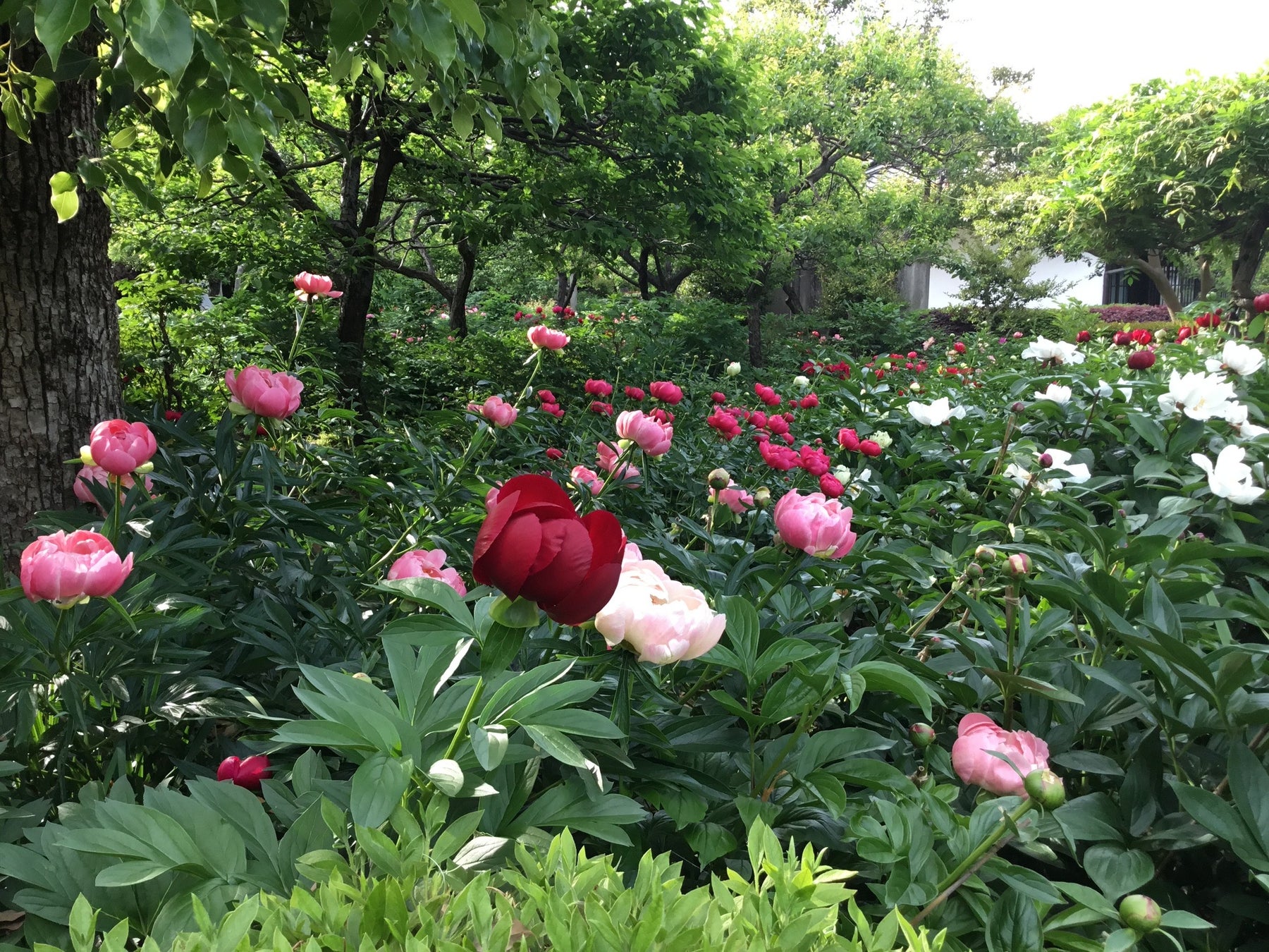 寺院境内で大切に育まれ、癒しの花園となりました。緑一面の中で咲く多種多様なシャクヤクの魅力に触れてみてください。