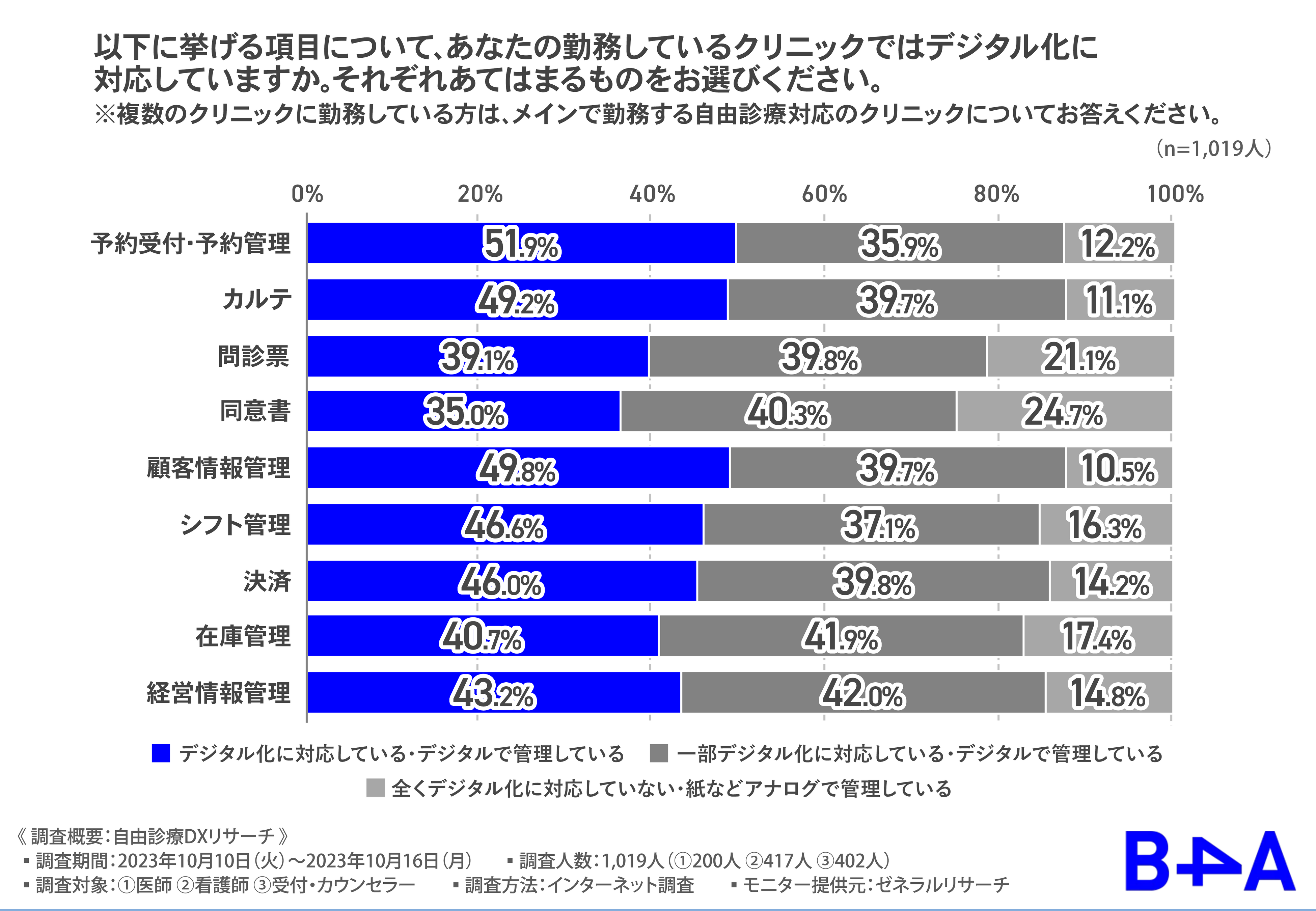 調査⼈数:1,019⼈(医師 200⼈/看護師 417⼈/受付・カウンセラー 402⼈)