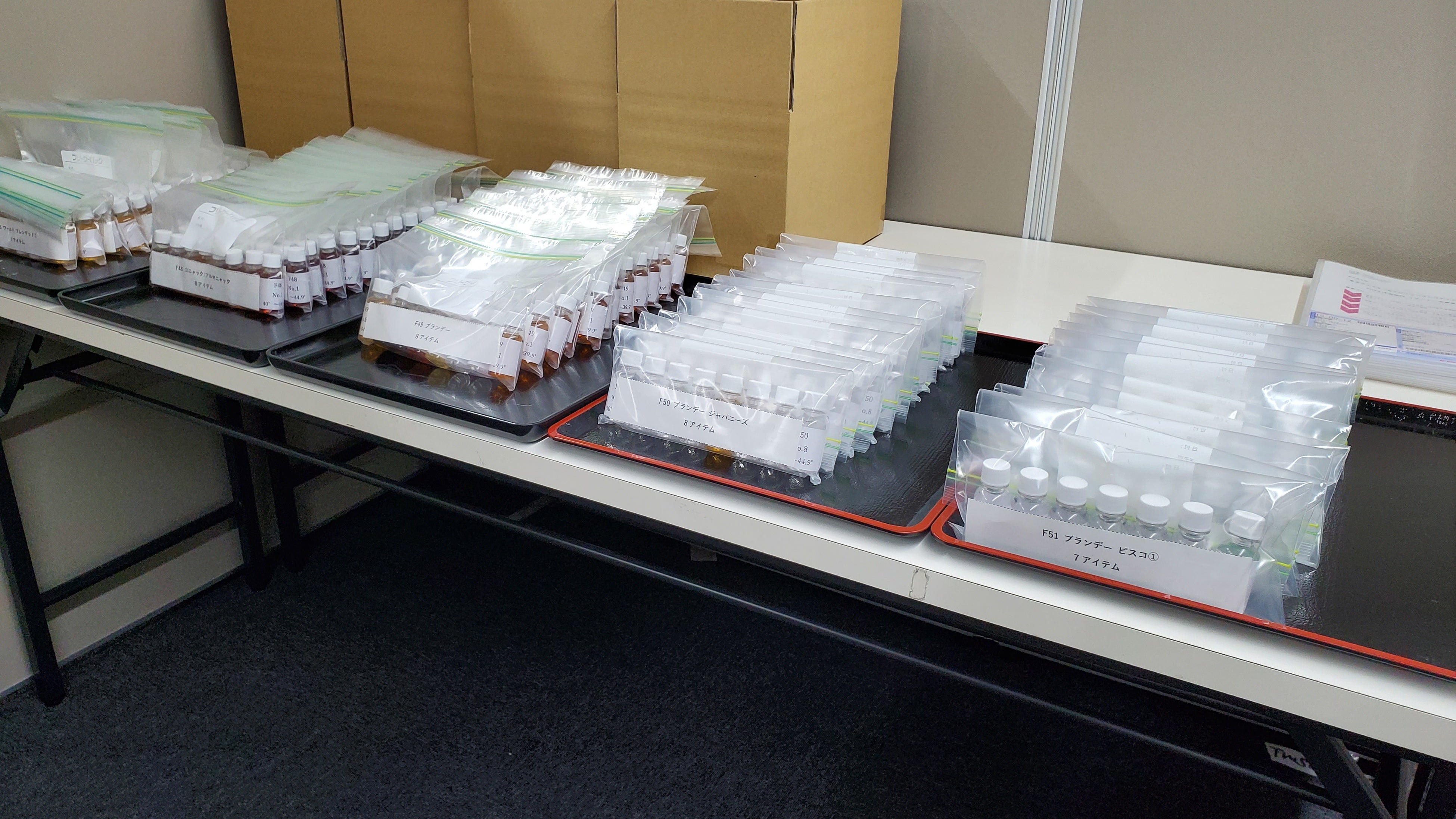 ④出品アイテムを合計3,000本以上に及ぶ小瓶に詰め替え、フライトごとに小分けにし、専用グラスとともに審査員に送付