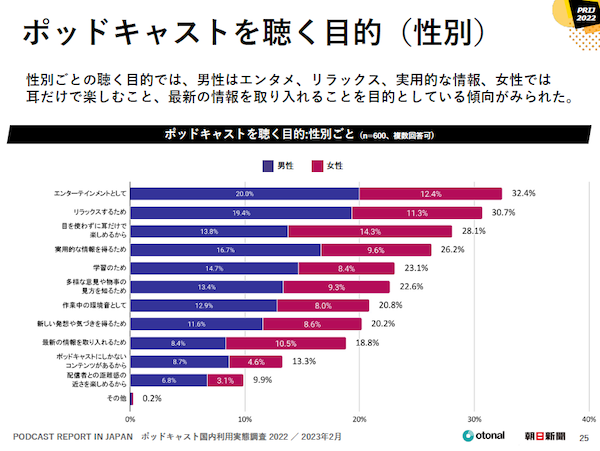 オトナル・朝日新聞社調べの「ポッドキャスト国内利用実態調査2022」※1 によると、ポッドキャストユーザーがポッドキャストを聴取する目的は、「多様な意見や物事の見方を知るため」「新しい発想や気づきを得るため」とする人が多くいます。