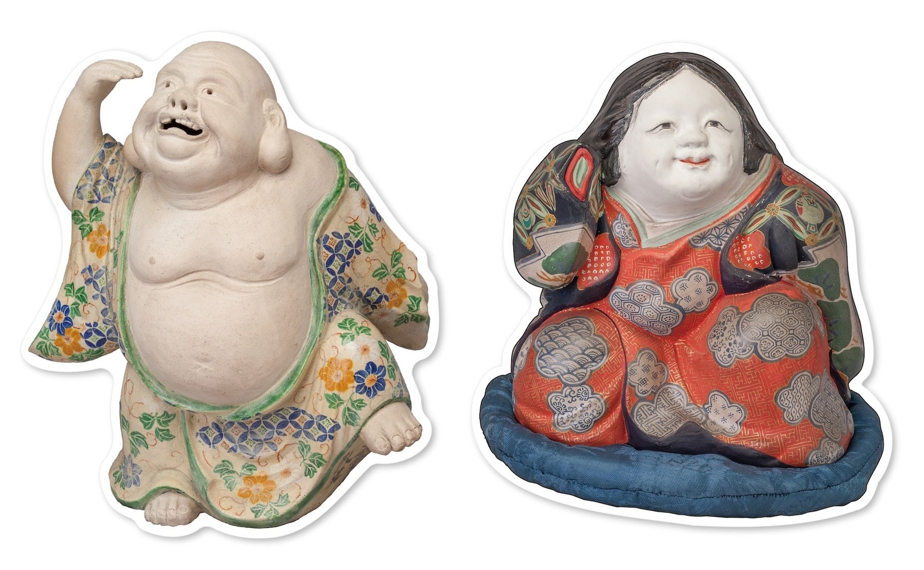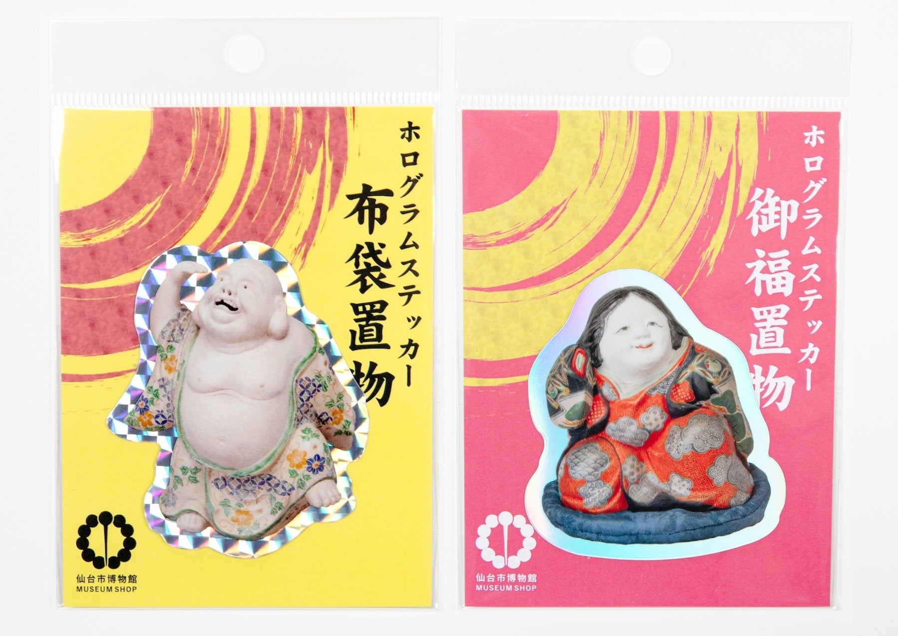 「布袋置物」と「御福置物(仙台市博物館蔵)」を、キラキラと光るホログラムステッカーにしました。虹色に輝く縁取りがつくことで、よりめでたい感を演出します。
