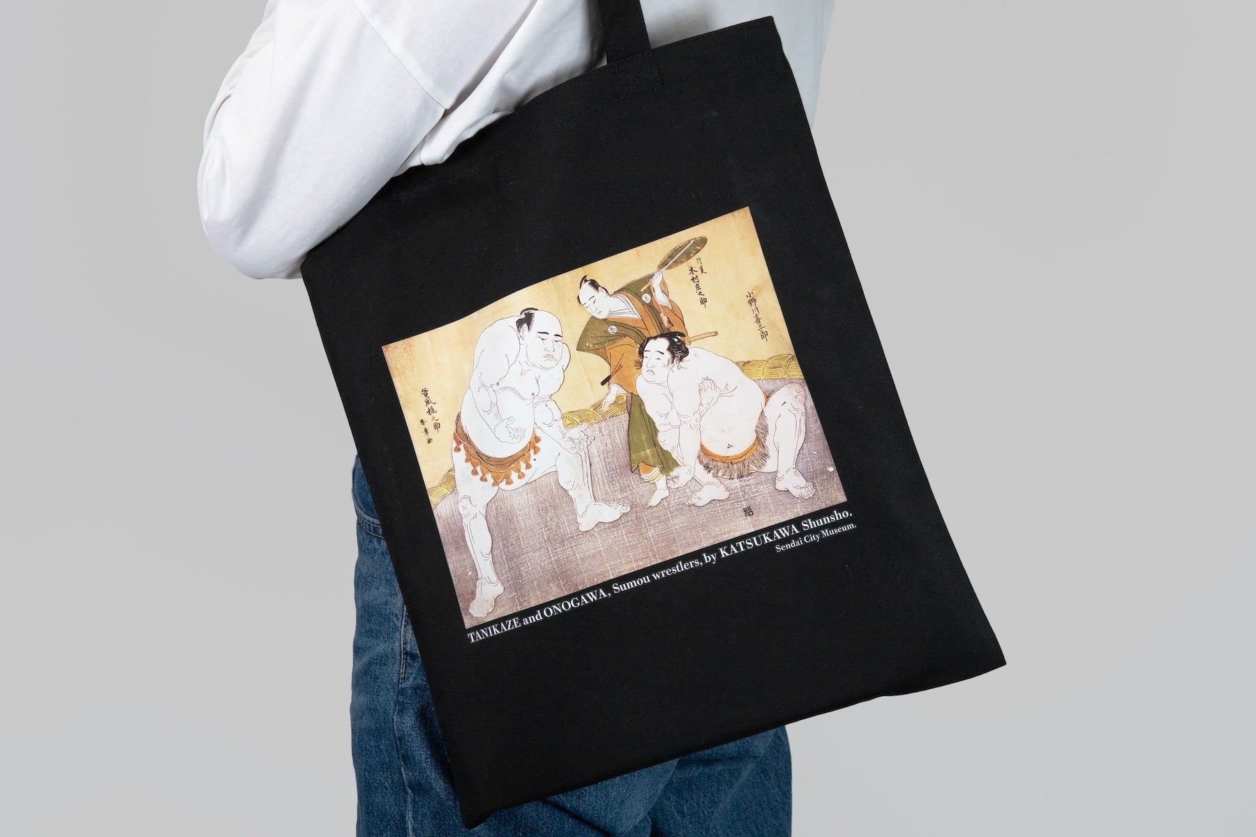 「谷風・小野川立合いの図」(勝川春章画)の迫力ある相撲絵のトートバッグです。江戸で大活躍した谷風(1750〜95)は、現在の仙台市若林区の出身で、初めて横綱を免許された力士です。大きな体が特徴で、小柄ながら技能派のライバル小野川とともに、人気を博しました。