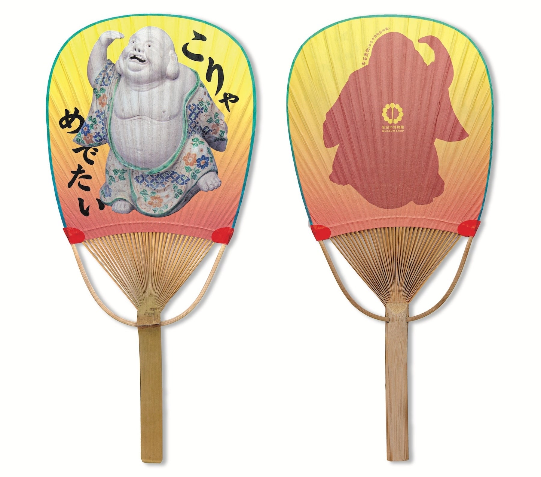 「こりゃ めでたい」展のキービジュアルに使われている「布袋置物(仙台市博物館蔵)」をミニサイズの竹団扇にしました。この表情、ポーズ、ふくよかな体!どこをとってもめでたい感があふれています。ぜひ、この団扇を片手に仙台城や仙台の街に繰り出していただき、めでたさをお裾分けしてください。