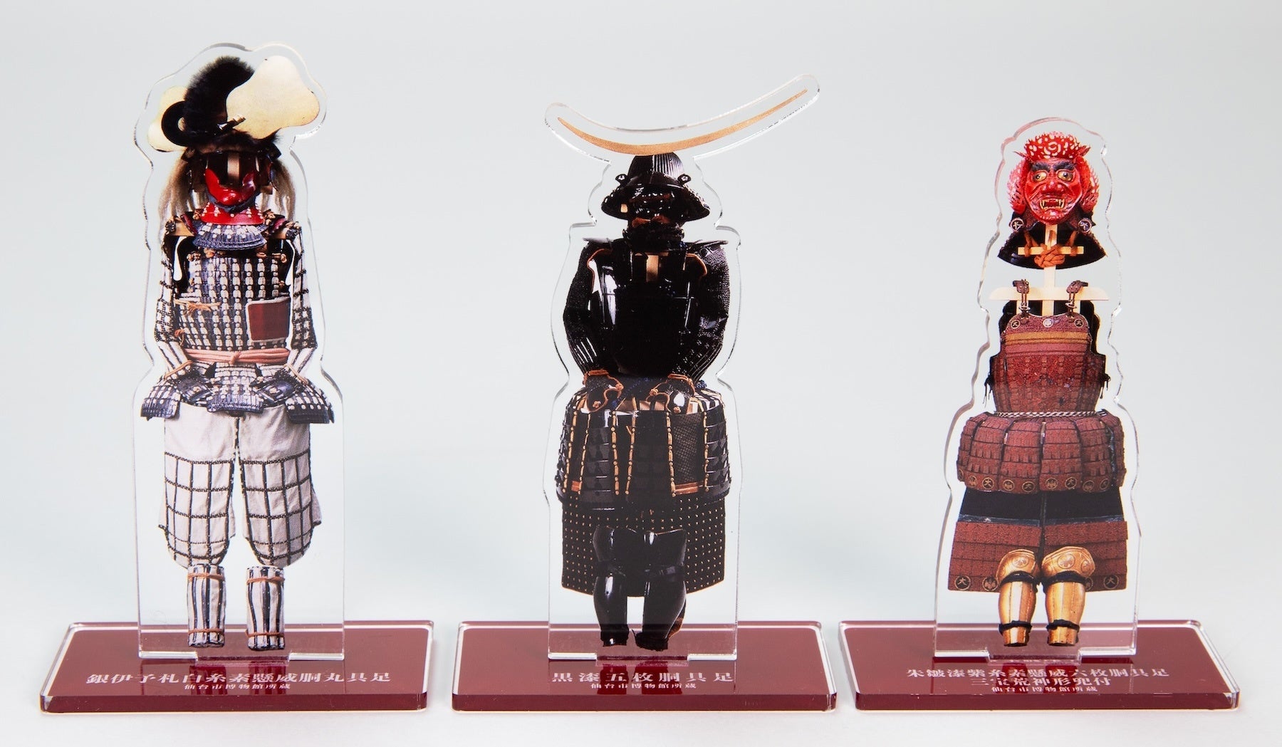 仙台市博物館が所蔵する個性豊かな具足の中から、「黒漆五枚胴具足」「銀伊予札白糸威胴丸具足」「朱皺漆紫糸素懸威六枚胴具足」の3種をアクリルスタンドにしました。アクリルスタンドは、自宅や職場に飾るのはもちろん、行楽や旅のお供としてもマストアイテムです。一緒に写真を撮ってSNSに投稿することが、若年層、とりわけ「推し」がいるファンの間で定番となっています。仙台の街巡りにもぜひお供させてみてはいかがでしょうか。
