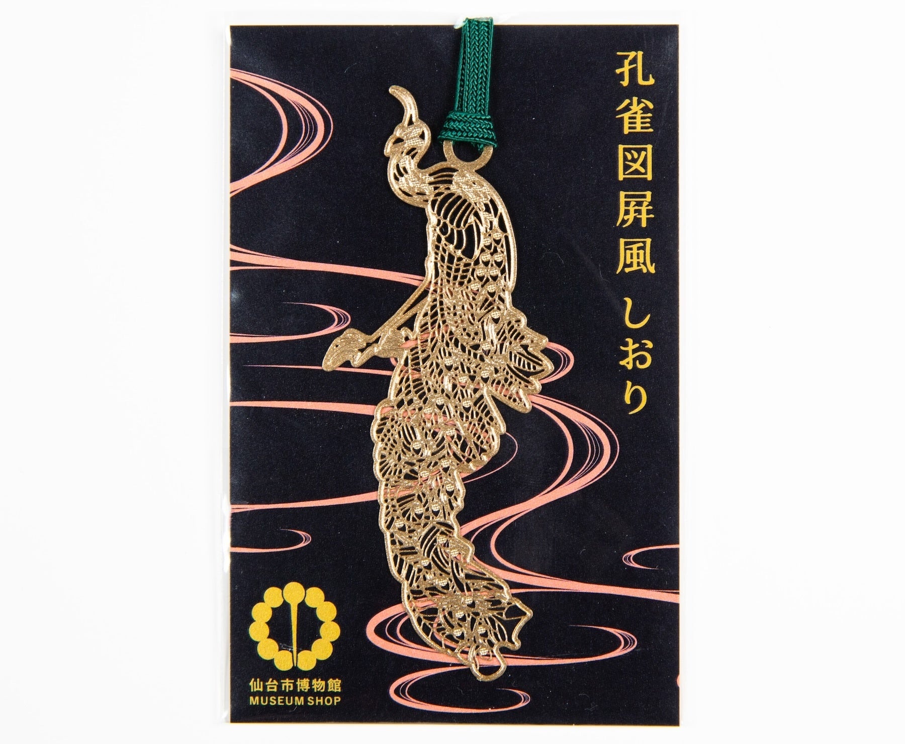 塩竈出身の日本画家・小池曲江筆の六曲一双の図屛風。その右隻に描かれた雄の孔雀をステンレス製のしおりにしました。繊細な孔雀の羽を表現するために、細かい抜き加工にこだわって製作しました。屛風では孔雀と一緒に海棠と流水が描かれているので、台紙には海棠の花の薄紅色で流水を描いています。