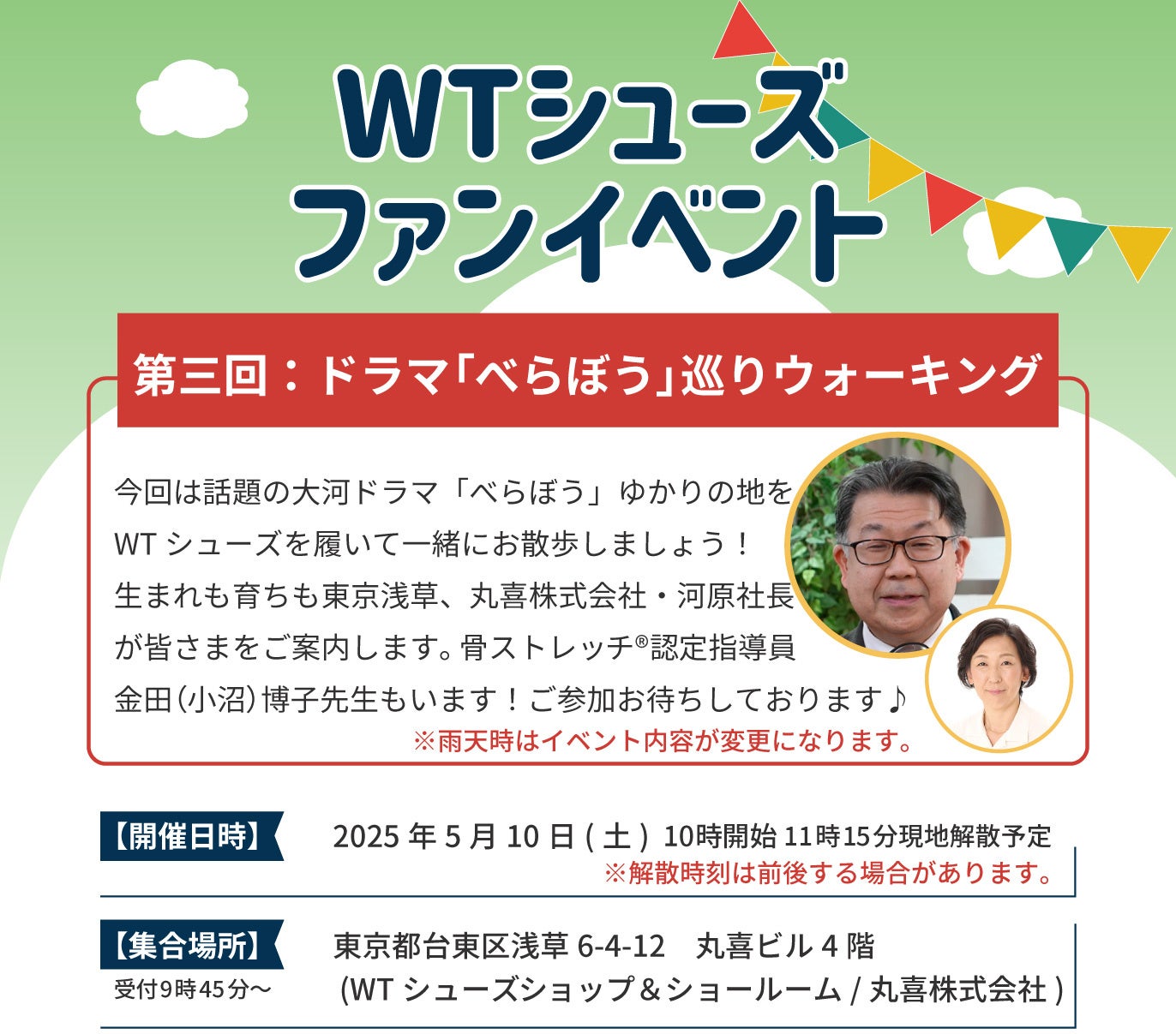内容:今回は話題の大河ドラマ「べらぼう」ゆかりの地をWTシューズを履いて一緒にお散歩。生まれも育ちも東京浅草、WTシューズの企画製造している靴メーカー丸喜株式会社の河原®勢朗社長が皆様をご案内します。当日は金田博子先生(骨ストレッチ認定指導員)もいらっしゃいます。