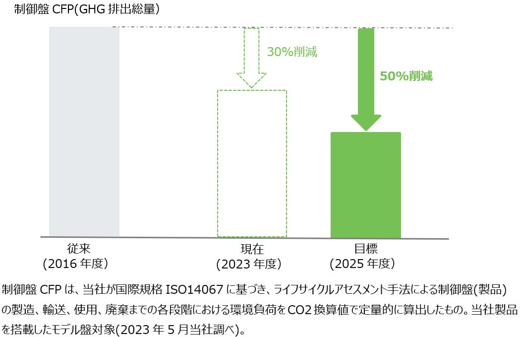 オムロンは、本取り組みをつうじて、省電力化・省資源化や環境負荷データの見える化、材料技術の開発を推進することで、オムロン製品による制御盤CFPを2025年度までに半減することを目指します。