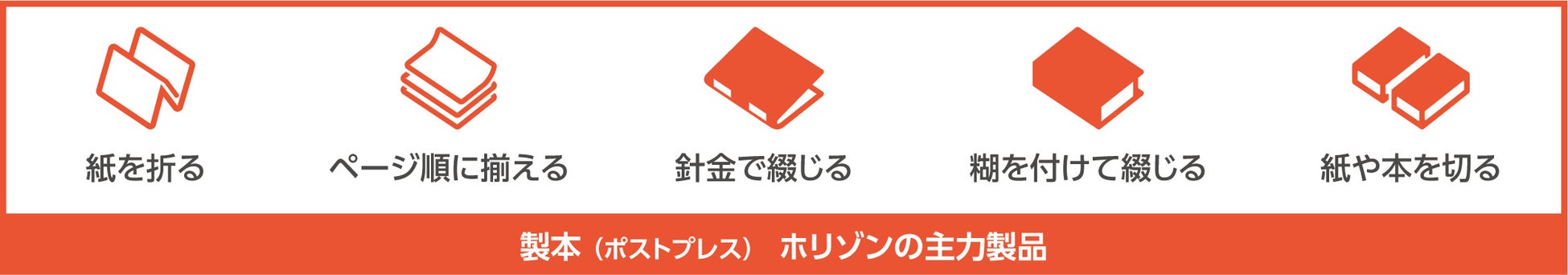 株式会社ホリゾンは、印刷(プレス)の後(ポスト)にさまざまな紙加工を行う産業用機器(=ポストプレス機器)事業を主力とし、業界に先駆けて「印刷製本工場の自動化」を掲げ、高度な自動制御による開発を進めています。印刷の後工程である紙加工において、その主流となる「紙折り」「丁合(ページ揃え)」「糊綴じ」「針金綴じ」「断裁」の5カテゴリーを産業機器で持つ、世界で唯一のポストプレス機器メーカーです。