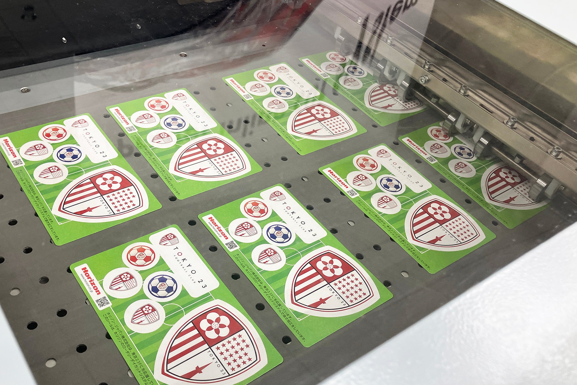 そんなホリゾンでは、自社ショールームや展示会などで、製品の性能を見ていただくために製品のデモンストレーションを日々行っています。実際の加工イメージが分かるように、デモンストレーションの際にはダミーデザインの印刷物を使って、その性能を見ていただきます。