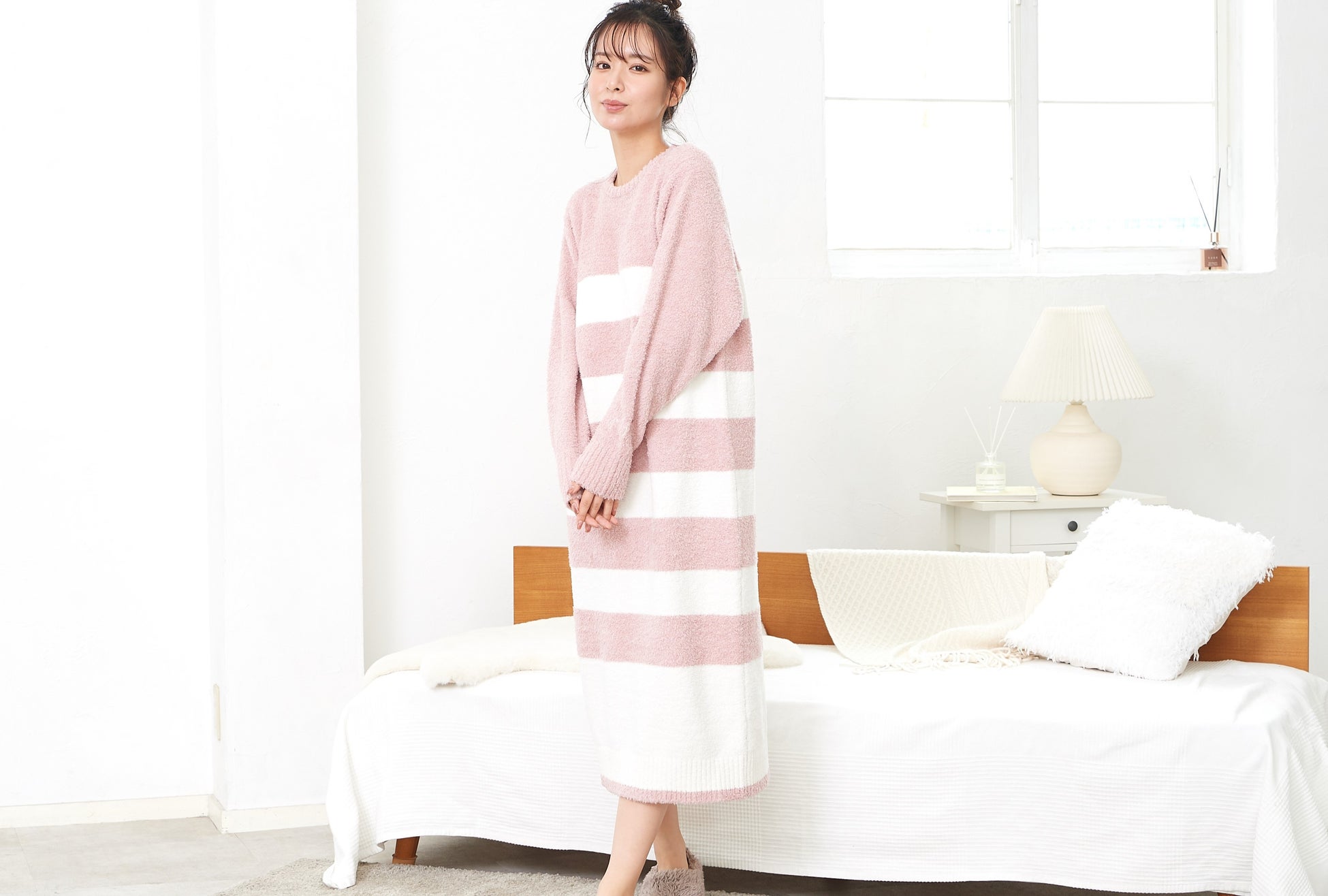 秋冬不動の人気のもこもこルームウェア。今年は杢カラーとのボーダーで表情をプラスしました。一枚でも可愛いワンピースですが、レギンスや靴下合わせでよりおしゃれに温かくコーデできるのも、魅力の一つです。ぜひ自分なりのコーデで楽しんでみて。