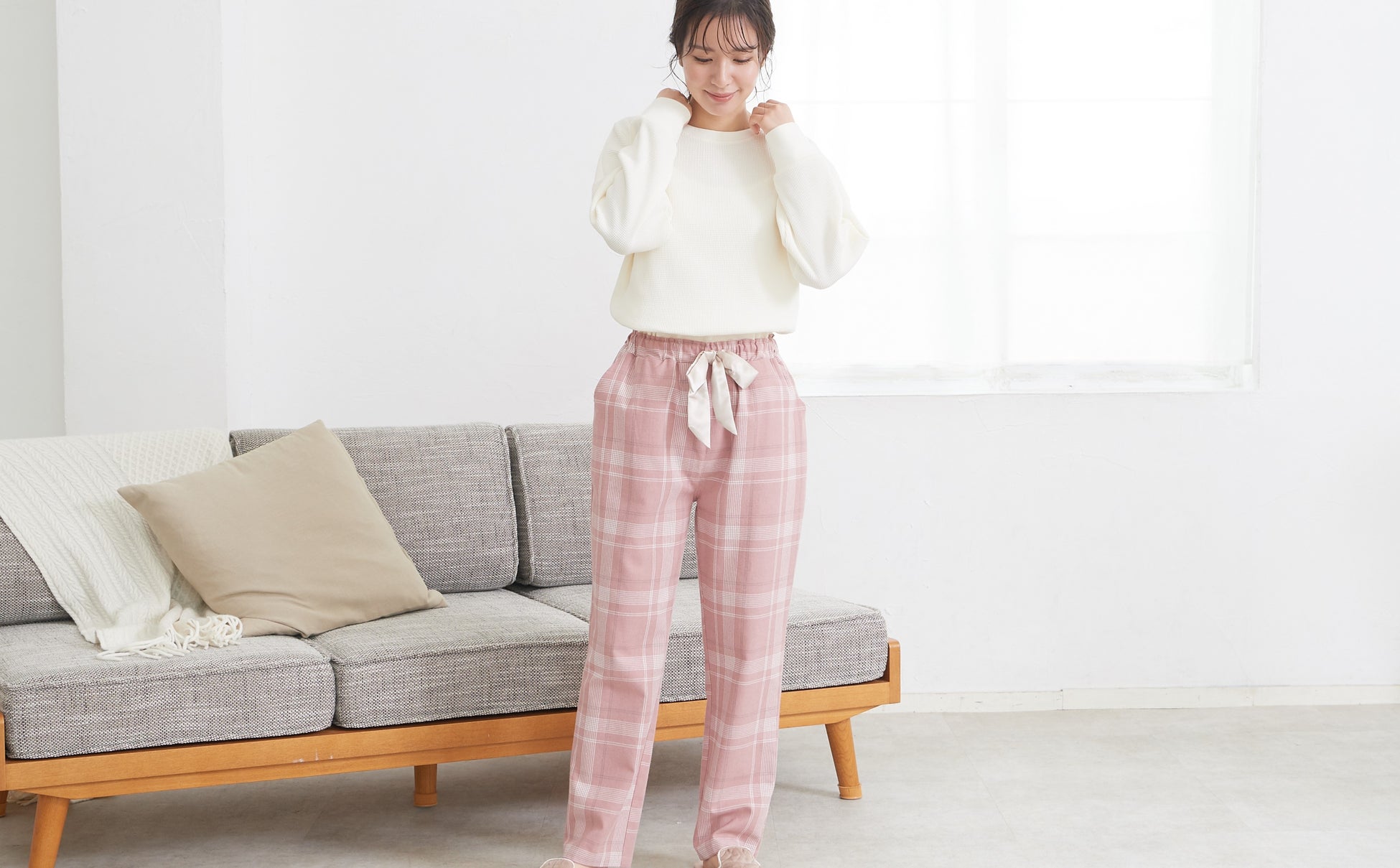 ポコポコとした質感が人気のワッフル素材のトップスに、柔らかなチェックのパンツはどちらもコットン100%。同じ素材でも質感が異なるので、急な来客など人前に出てもOKな洋服感覚のルームウェアです。パンツのサテンリボンはシルエットを邪魔しないので、トップスをインにしてもアウトにしても楽しめます。