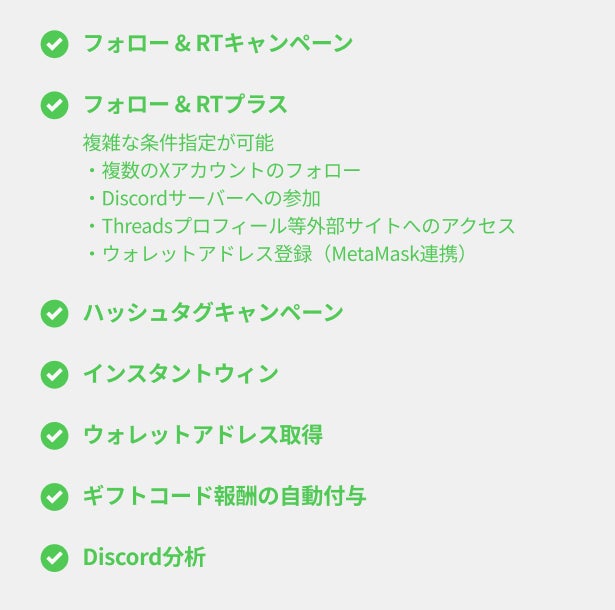 Web3企業に特化したサービスとして、2023年7月にDiscord対応、MetaMask連携、Threads等外部サイト対応を開始。将来的にはトークン報酬のシームレスな付与も実現します。今後、TikTokやInstagram等にも順次対応し、ファンマーケティングを推進しやすい環境を提供していきます。