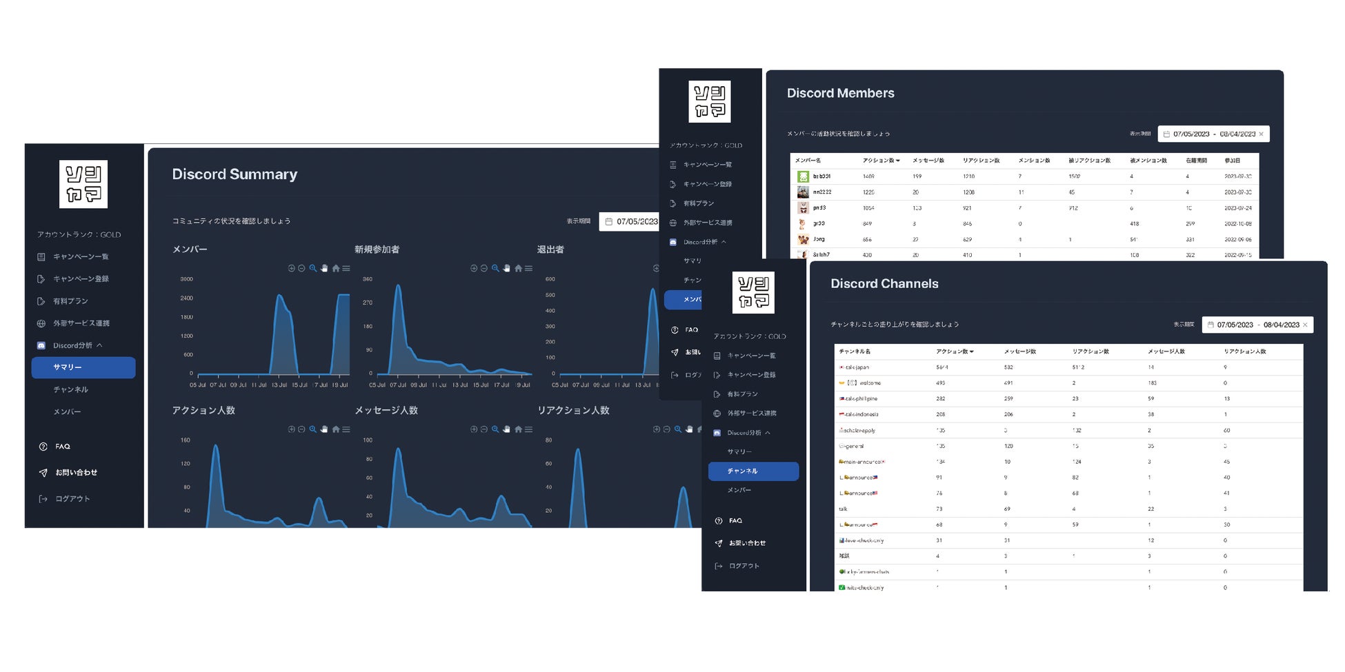 サーバーへの参加・退出人数はもちろん、アクション人数や活発にアクションしている参加者を可視化できるようになりました。メンバーとチャンネルの盛り上がりも項目ごとに並び替えて確認可能です。